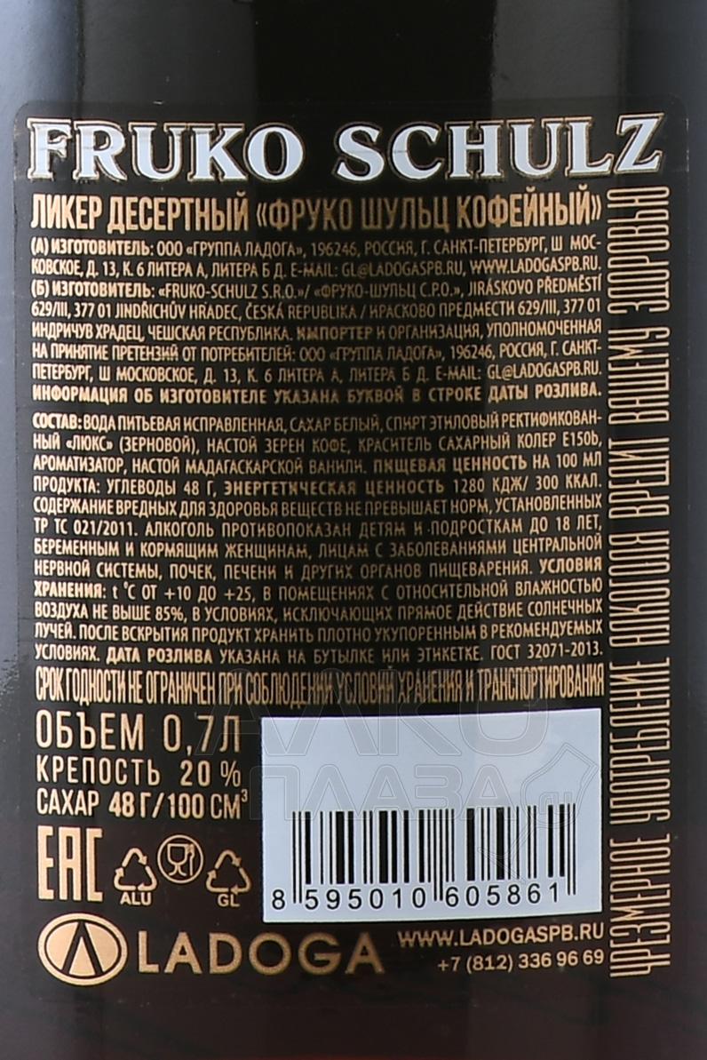 В мире великое множество кофейных ликеров. Одним из них является Fruko Schulz Coffee с приятным энергичным вкусом, оказывающим бодрящее действие на организм. При производстве этого ликера используют ароматизаторы со вкусом кофе и сливок, мадагаскарскую ваниль для мягкого аромата и воду высокой степени очистки.