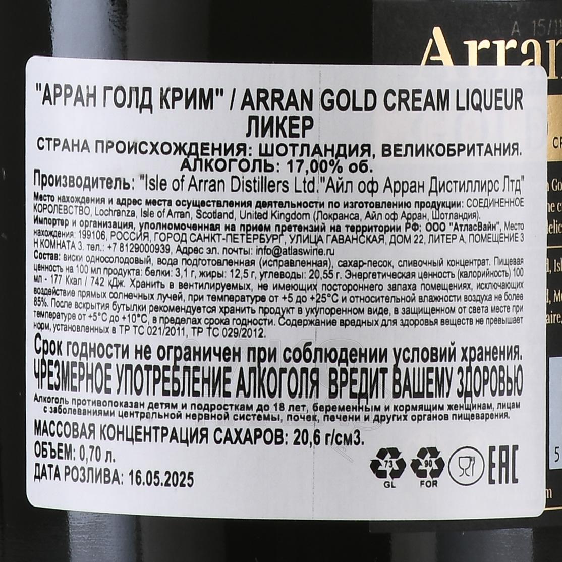 Ликер Arran Gold Cream 0,7 л — сливочный спиртной напиток премиум-класса с острова Арран в Шотландии. Его основа — классический местный односолодовый виски, выдержанный в дубовых бочках минимум три года. Скотч смешивается с натуральными сливками высшего качества, создавая мягкую, бархатистую консистенцию. Купаж отличается естественным сливочно-карамельным вкусом с выраженными нотами ванили, ириски и нежным намеком на солодовый спирт. Образец не содержит искусственных ароматизаторов и консервантов, благодаря чему обладает приятным и сбалансированным характером. Производится на винокурне Isle of Arran Distillery, открытой в 1995 году, известной экологически чистым подходом и ручным трудом на всех этапах изготовления.