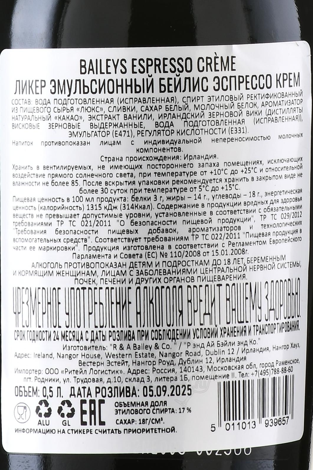 Ликёр Baileys Espresso Creme 0,5 л представляет собой густой, в меру сладкий напиток с ярко выраженным профилем, созданный на основе ирландского зернового виски, свежих сливок и экстракта ванили. Производство осуществляется в Ирландии с применением фирменной технологии эмульгирования, обеспечивающей стабильную текстуру и однородность состава. В рецептуре используются натуральные компоненты, придающие характерную горчинку и глубину купажу.