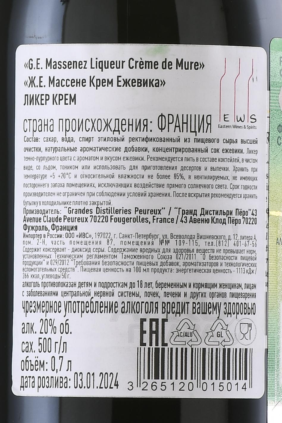 Ликер G.E. Massenez Creme de Mure 0,7 л — один из наиболее популярных французских алкогольных напитков в своей категории. Он обладает шелковистой текстурой и относится к десертным крем-ликерам. Основой является ректификованный зерновой спирт, на котором настаиваются спелые ягоды ежевики. Мацерация длится 3 месяца. В состав добавляются сахар (500 г на л) и вода. Ликер не содержит красители, консерванты и ароматизаторы.