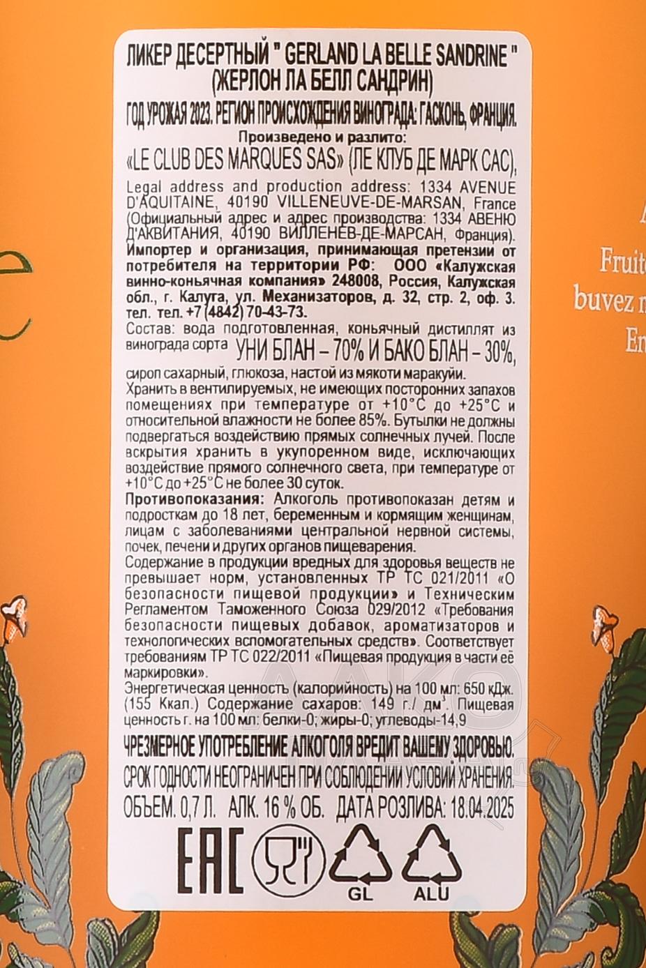 Ликёр Gerland La Belle Sandrine 0,75 л делают в Гаскони. В основе рецептуры — выдержанный дистиллят из винограда местных сортов Уни Блан (70%) и Бако (30%), дополненный тростниковым сахаром и настоем плодов маракуйи. Процесс создания напитка включает купажирование спиртовой базы с ароматным фруктовым экстрактом, дальнейшую выдержку в ёмкостях для стабилизации вкуса и последующую фильтрацию. Виноград, использующийся для получения алкогольный основы бленда, растёт на песчаниковых и глинисто-известняковых почвах Bas-Armagnac, на высотах до 250 метров над уровнем моря. Местный климат сочетает тёплые дни, прохладные ночи и около 2000 солнечных часов в год, благодаря чему ягоды сохраняют кислотность и ароматические компоненты, которые частично передаются дистилляту.
