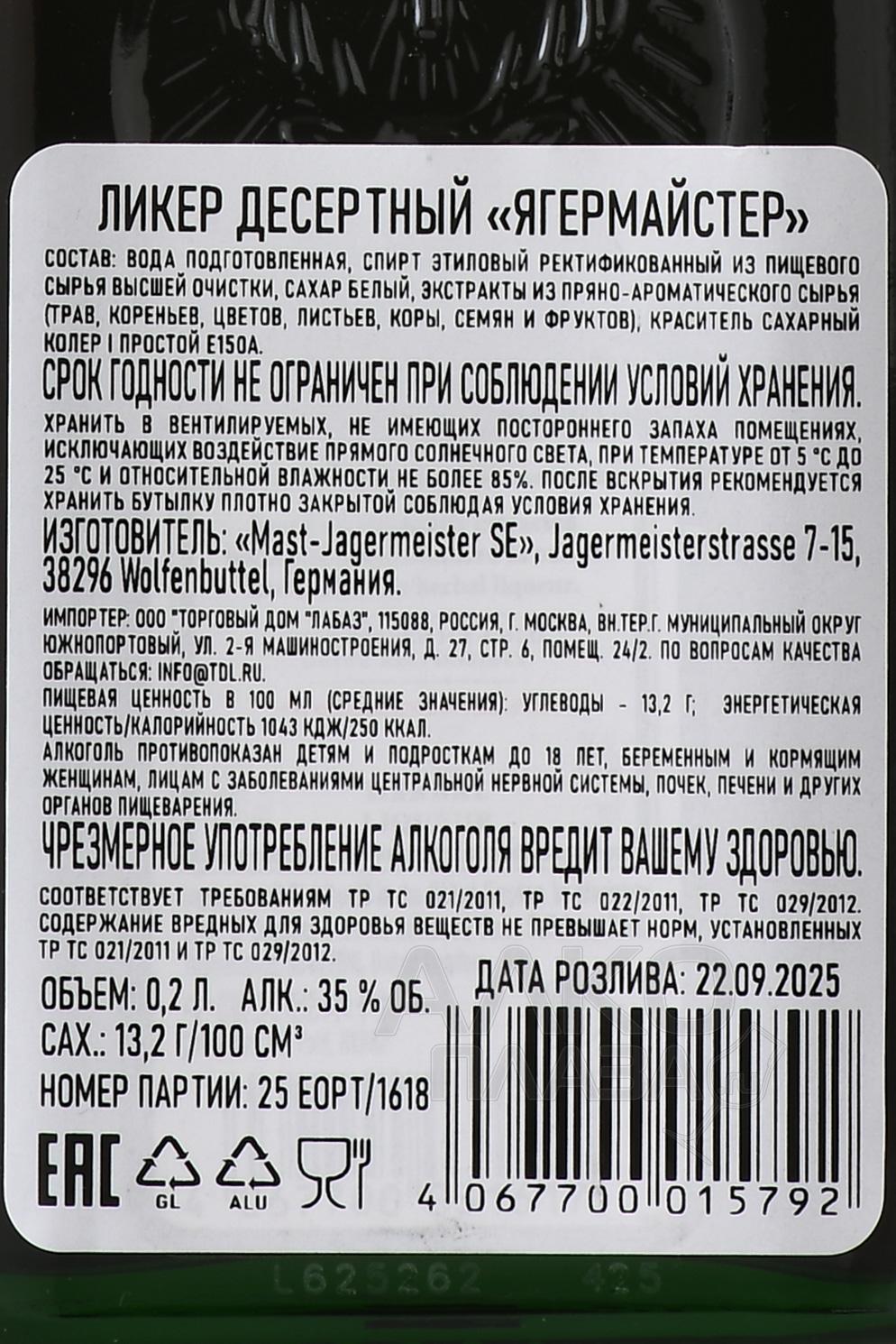 Jagermeister - ликер десертный Ягермайстер 0.2 л