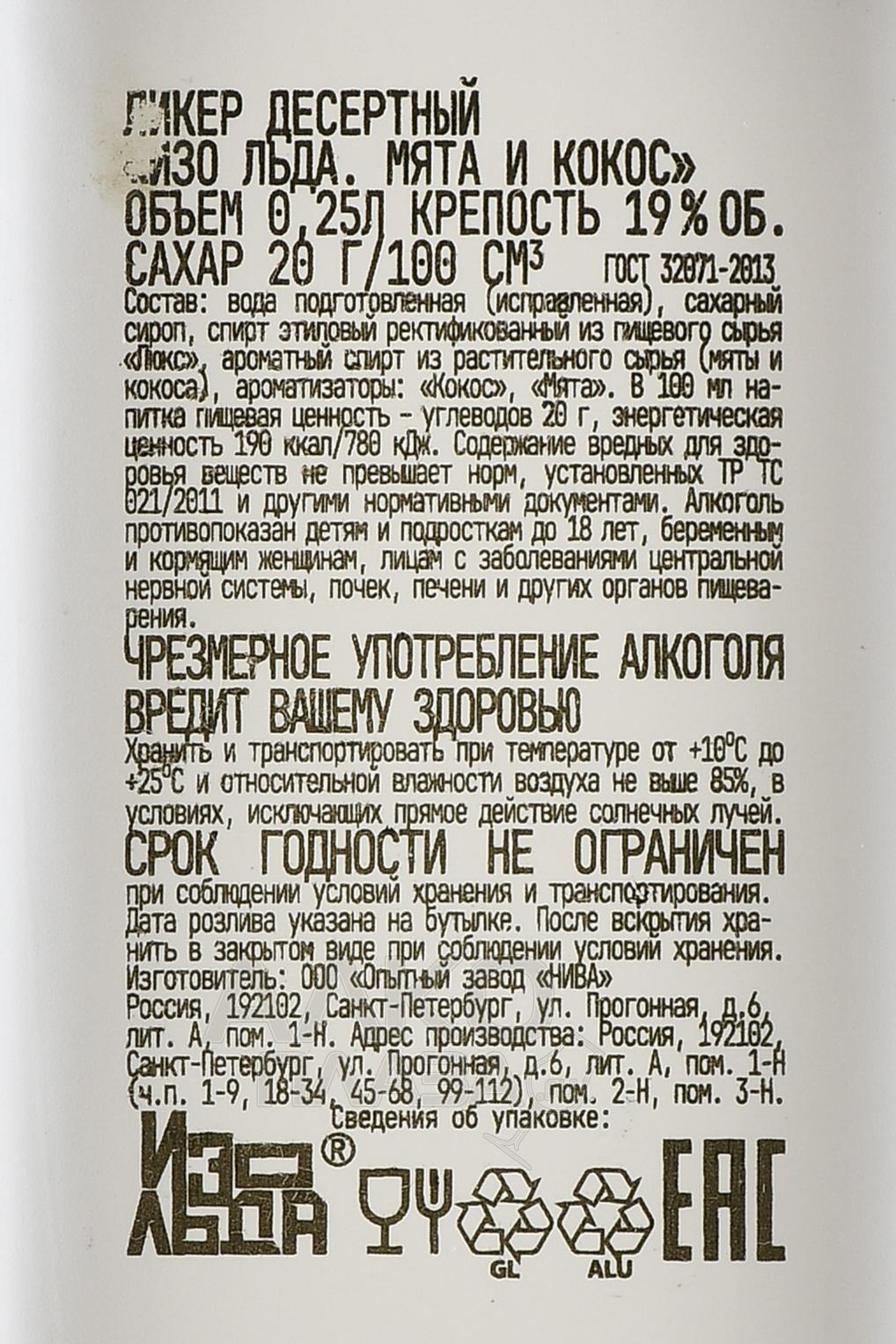 Ликер Изо Льда Мята Кокос – свежесть тропиков в ледяной огранке. Мякоть кокоса встречается с охлаждающим мятным акцентом — необычно, нежно, небанально. Это напиток, сочетающий в себе чистую мятную прохладу и эстетику цифровой эпохи. Крепость 19% — идеальный баланс вкуса и легкости. Объем: 0,25 л — удобный формат для частного потребления на домашних вечеринках, открытых пространствах и гастро-миксах.