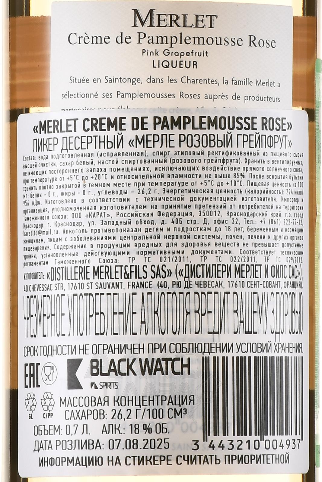 Ликёр Merlet Pink Grapefruit 0,7 л — напиток, созданный во Франции мастерами дома Мерле. Он представляет собой цитрусовую композицию, основанную на спелом розовом грейпфруте. В составе используется настой плодов, нейтральный спирт высокой степени очистки и немного сахара. Деликатная переработка позволяет сохранить яркий фруктовый характер и естественную свежесть, дополненную мягкой сладостью. Невысокая крепость, всего 18 %, делает релиз универсальным.