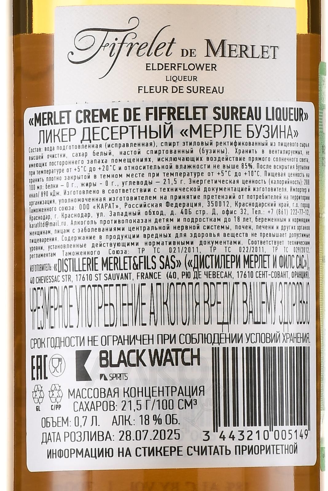 Ликер Merlet Sureau 0,7 л создают на основе настоев цветков бузины, которые собирают в начале лета, когда соцветия достигают максимальной ароматической концентрации. Производитель использует семейные технологии мацерации, сохранившиеся в хозяйстве Мерле с XIX века. Цветочное сырьё выдерживают в нейтральном спирте, затем фильтруют и смешивают с сахарным сиропом. Купаж сохраняет свежий стиль, а его структура остается гладкой благодаря точному балансу спирта и сахара.