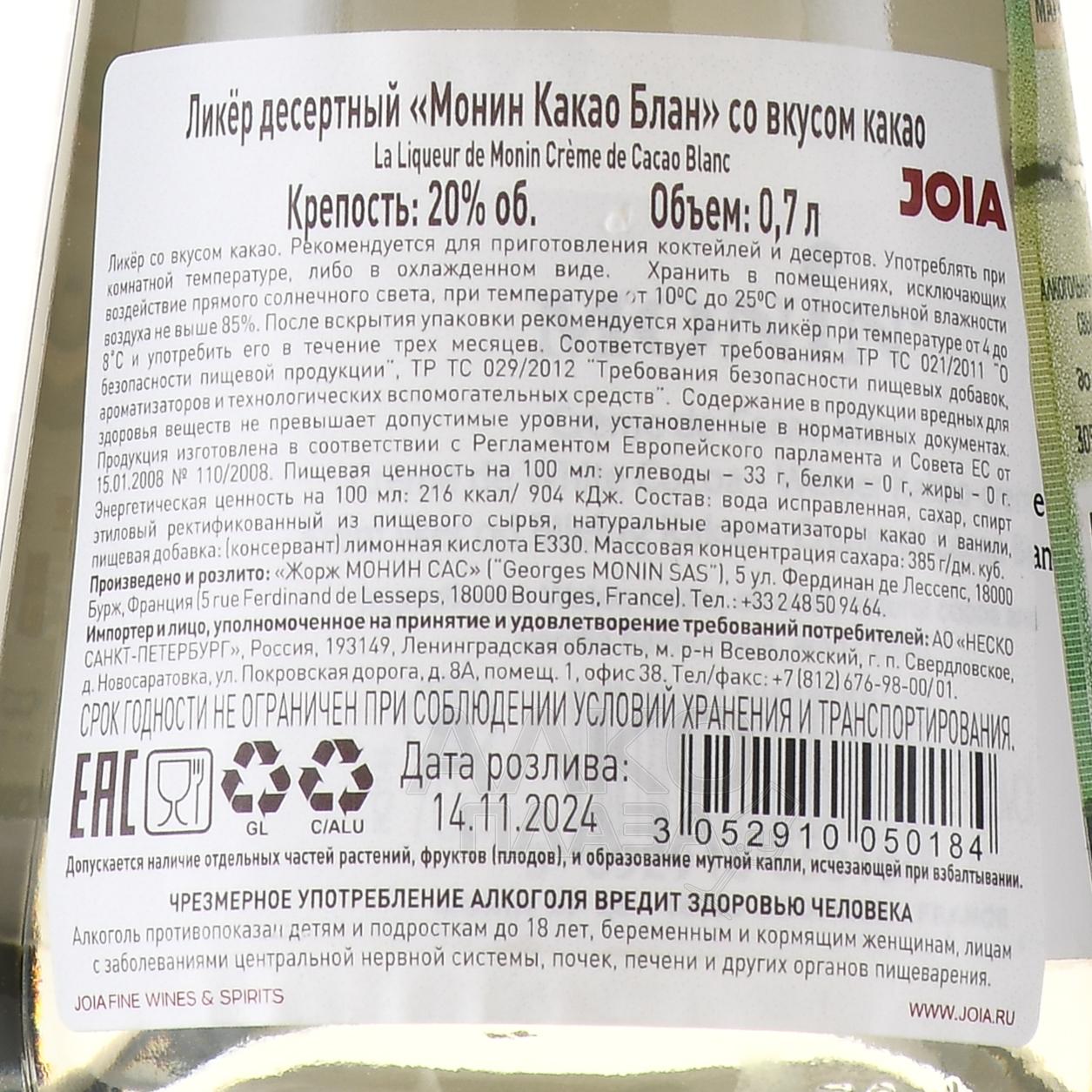 Monin Creme de Cacao Blanc - ликер Монин Какао белое 0.7 л