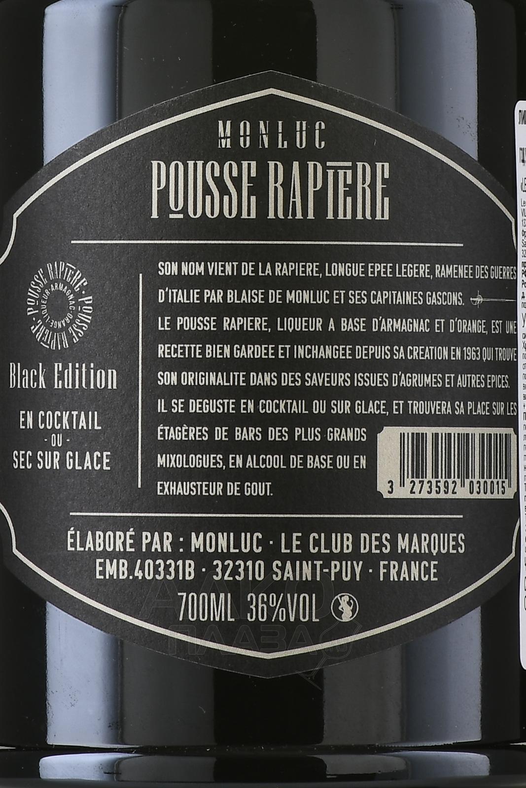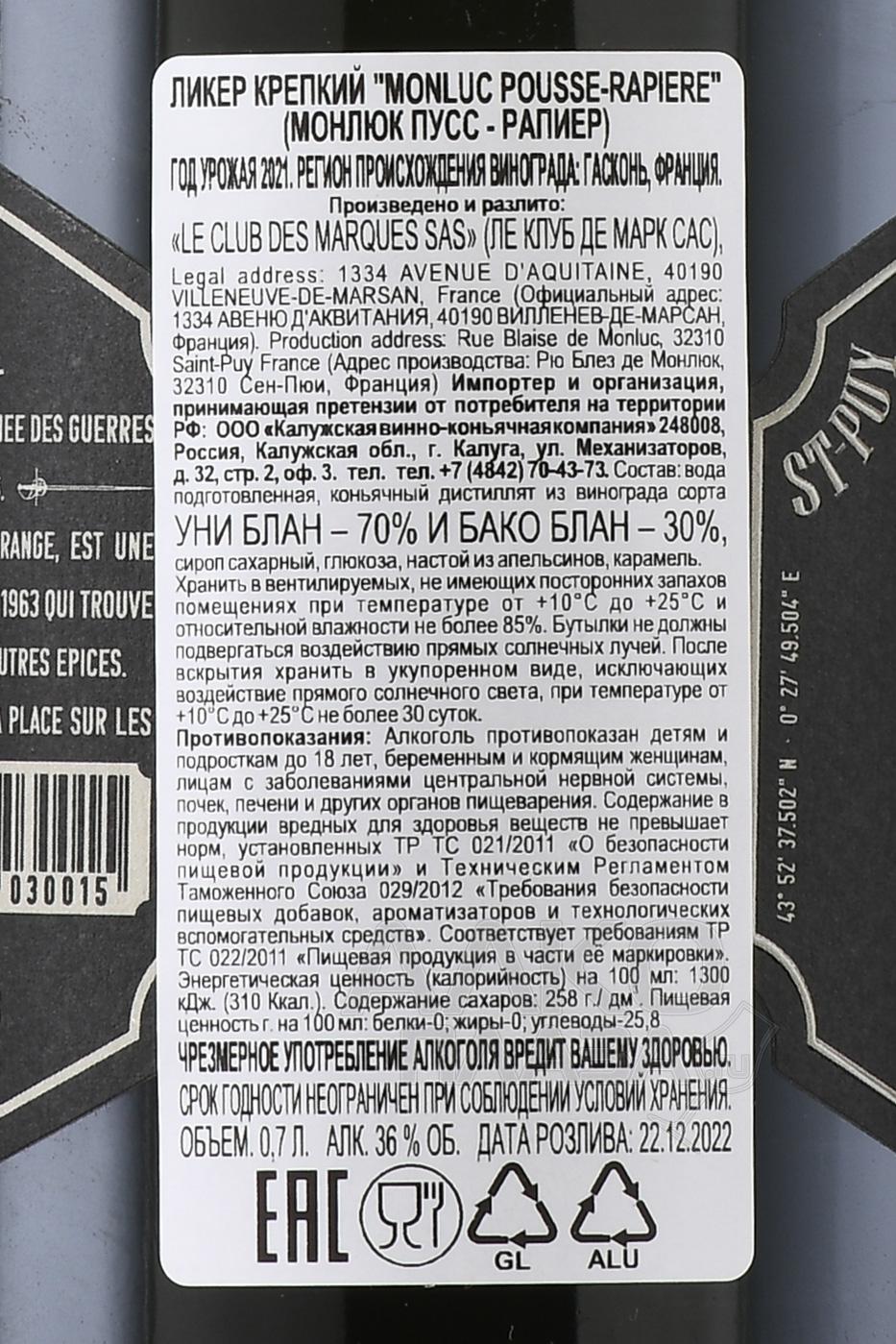 Ликер Monluc Liqueur Pousse Rapiere 0,7 л — редкий образец гасконского алкоголя, созданный в Château de Monluc в коммуне Сен-Пюи. Напиток основан на арманьяке, выдержанном в дубе, и настойке горьких апельсинов. Рецепт появился в 1963 году и с тех пор остаётся неизменным. Терруар Жера известен холмистым рельефом, песчано-глинистыми почвами и сочетанием тёплого континентального климата с морским влиянием, что определяет характер винограда, используемого для базового спирта. После перегонки дистиллят проходит выдержку, затем соединяется с цитрусовым экстрактом. Смешивание проводят партиями, уделяя внимание балансу между насыщенностью спиртовой основы и мягкостью сладких мотивов. Методика делает купаж плотным, но при этом свежим, с чётким узнаваемым стилем региона.