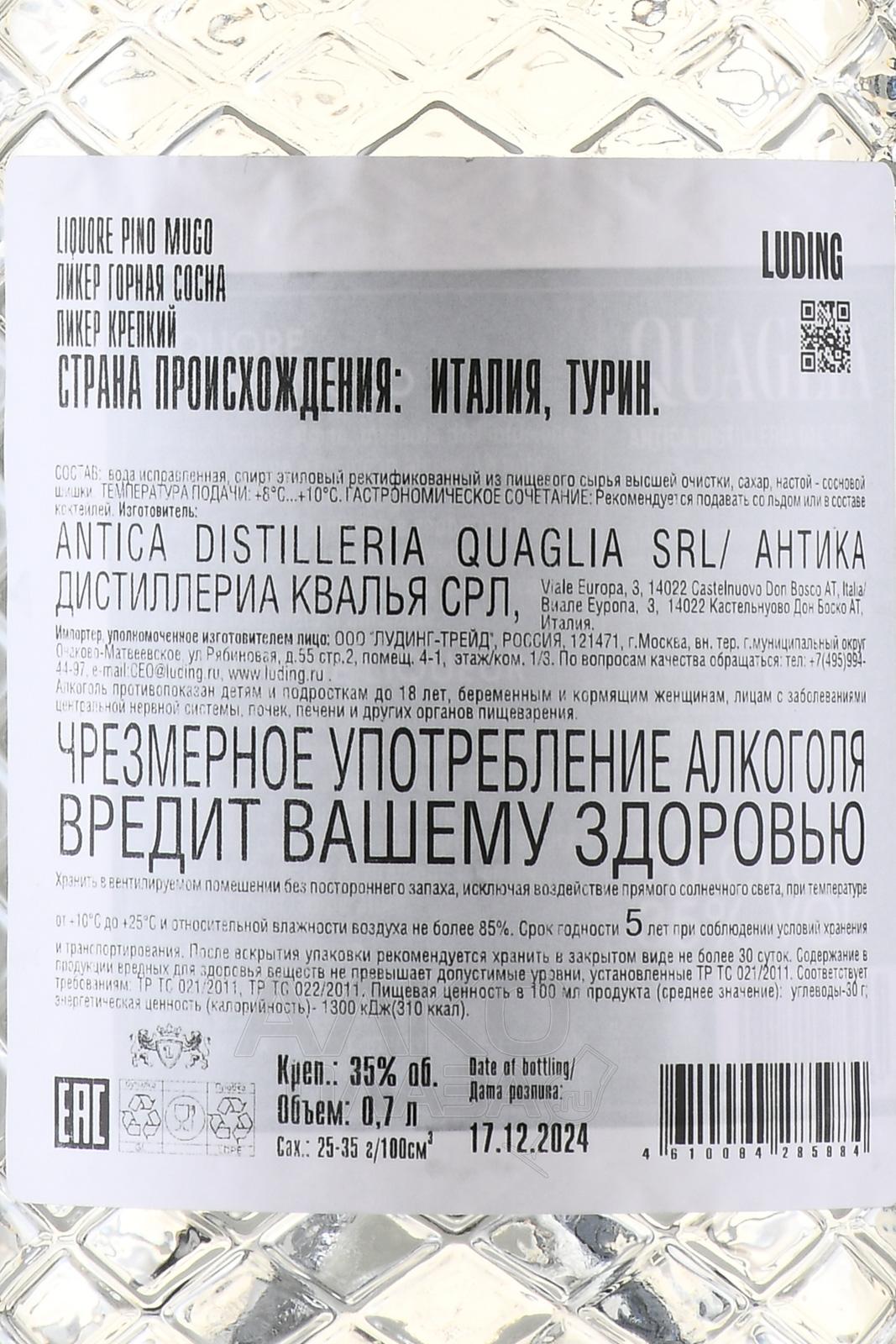 Ликер Pino Mugo Antica Distilleria Quaglia 0,7 л — ароматный десертный напиток итальянской марки, которому присущи 35-градусная крепость и сладость в пределах 350 г/л. Весь производственный цикл осуществился на заводе в Турине путем деликатной обработки сосновых шишек, зернового ректификата и сахарного сиропа. Благодаря применению долгой мацерации, ликер приобрел насыщенный букет.