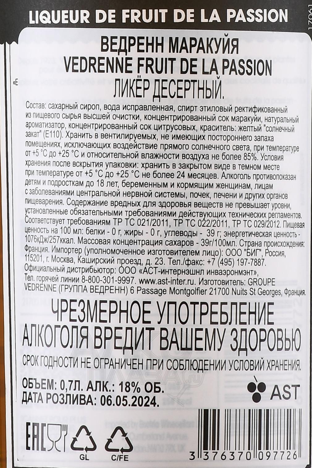 Vedrenne Liqueur de Fruit de la Passion - ликер Ведренн Маракуйя 0.7 л