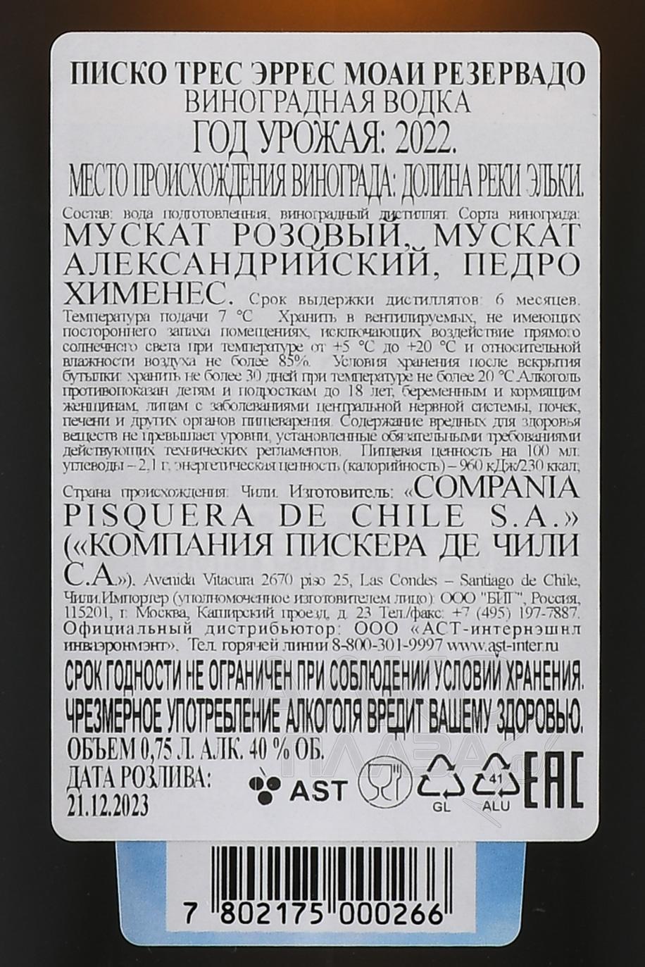 Писко Tres Еrrес Reservado 0,7 л — национальный чилийский напиток, представляющий собой виноградный дистиллят из смеси сортов Педро Хименес и Москатель. Сырье для производства выращивается в долине реки Эльки в провинции Кокимба — уникальном терруаре с особыми природными условиями. Сброженный сок подвергают однократной перегонке, а спирты выдерживают в дубовых бочках в течение 6 месяцев. Писко Эльки Трес Еррес Резервадо поставляется в подарочной картонной коробке и подходит на роль оригинального презента.