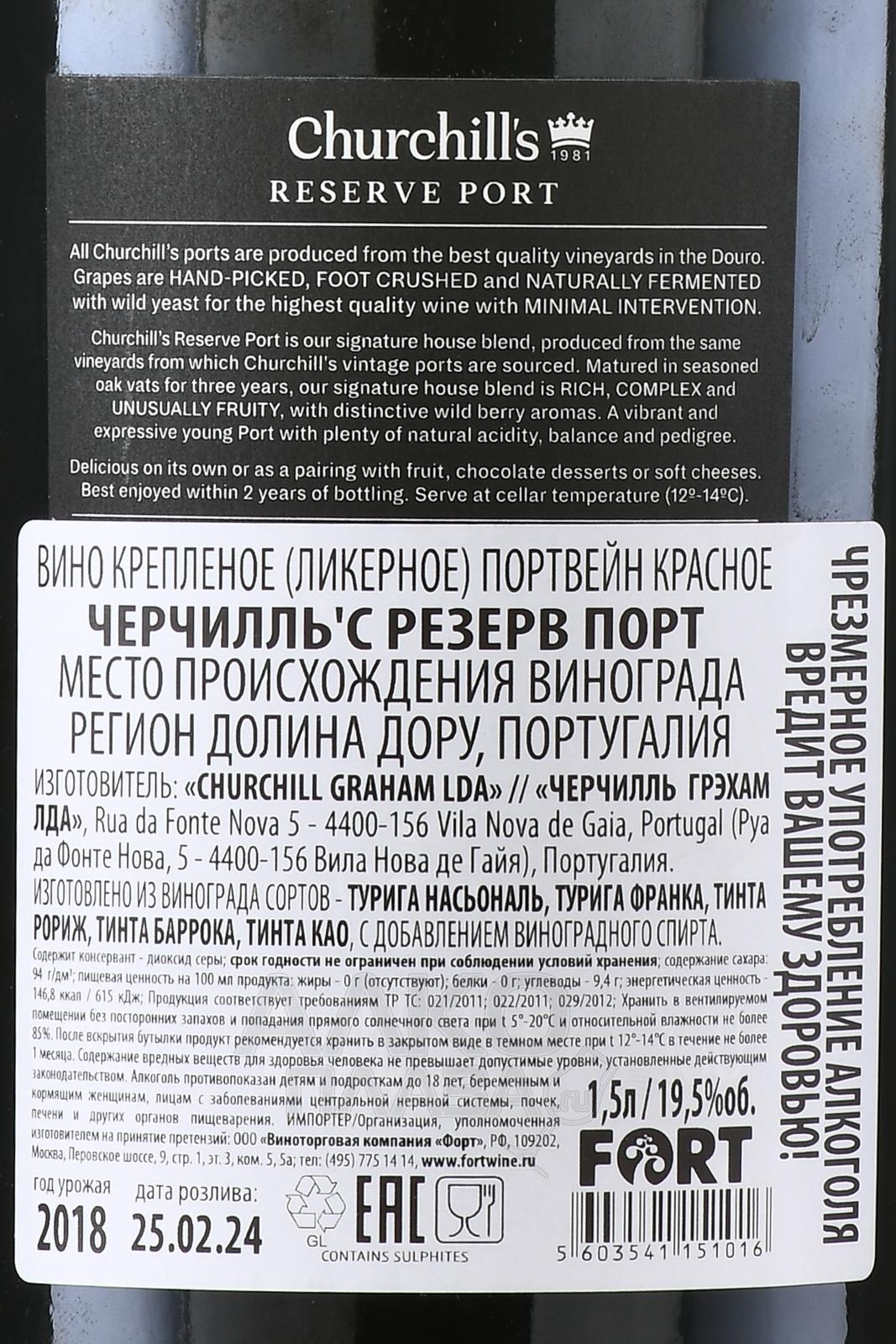 Портвейн Churchill`s Reserve Port 2018 год 1,5 л – премиальный напиток, созданный из отборного винограда, выращенного в живописной португальской долине Дору. Терруар этого региона знаменит своими крутыми склонами, сланцевыми почвами и идеальным микроклиматом, способствующим получению ягод с выраженным характером. Технология производства включала традиционный метод частичного брожения с последующим добавлением виноградного спирта, который останавливал ферментацию, сохраняя натуральную сладость вина. После купажирования портвейн выдерживался около трёх лет в дубовых бочках, приобретая насыщенность и сложность вкуса.