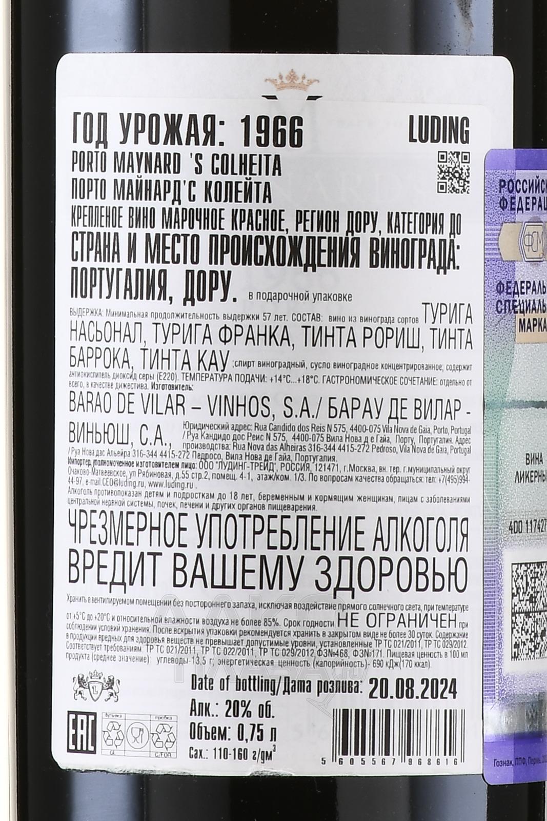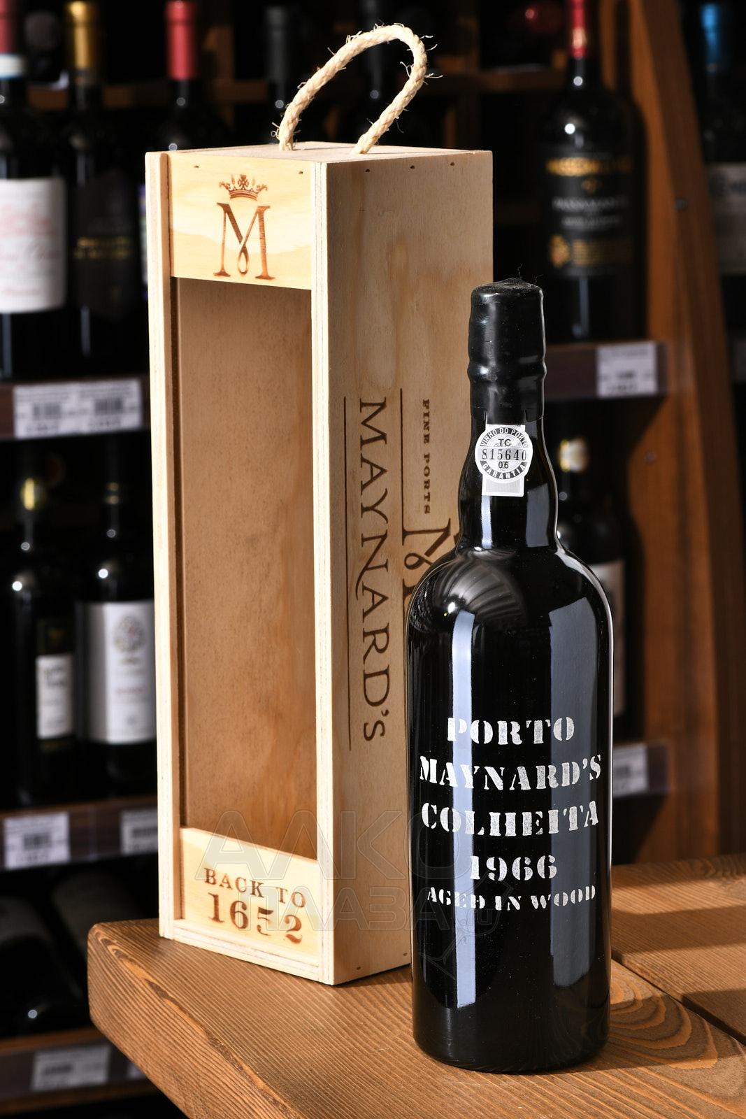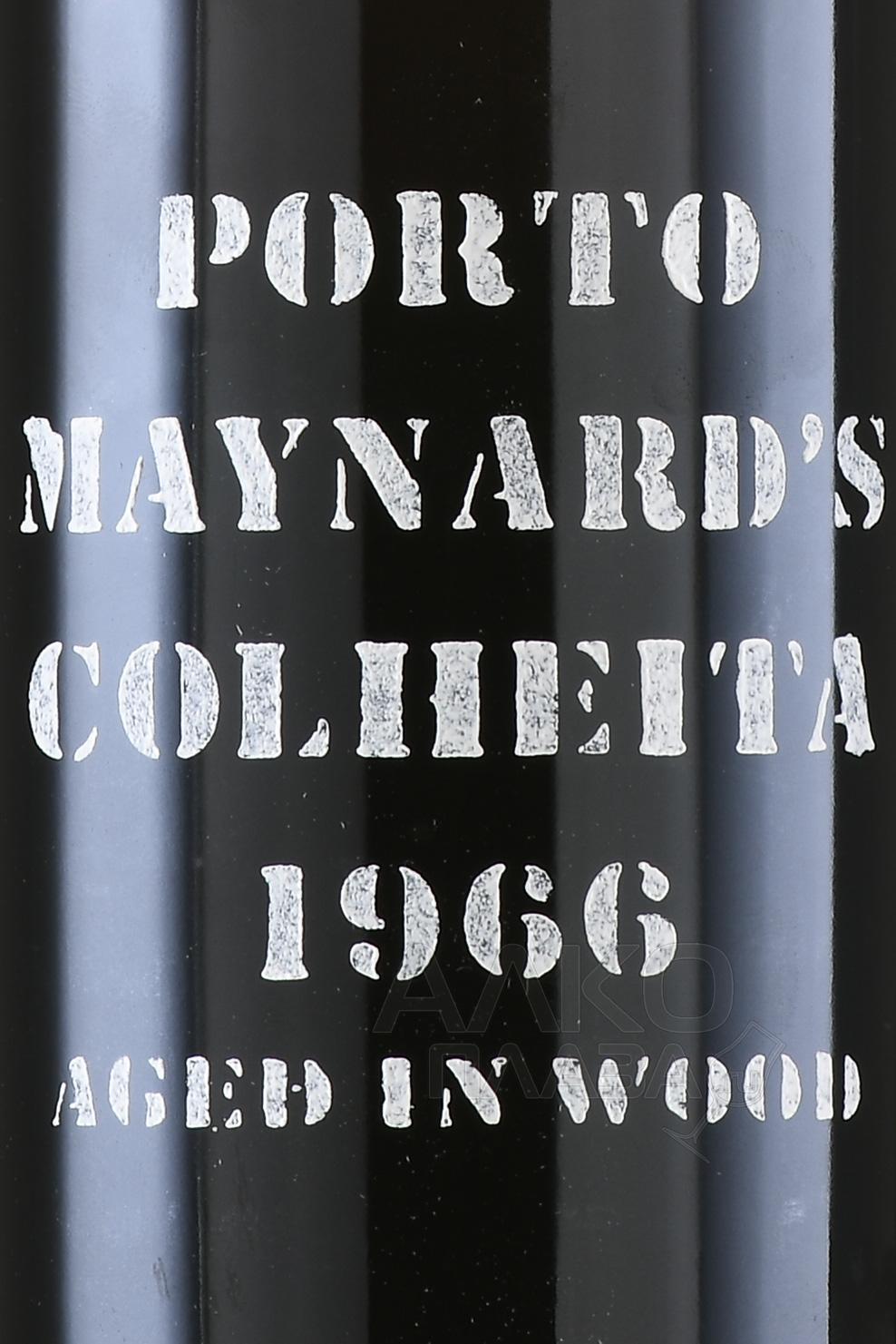 Портвейн Maynards Porto Colheita 1966 г. 0,75 л в д/у — сувенирный релиз традиционного марочного креплёного вина из Португалии. Напиток относится к винтажной категории, его создали из ягод, собранных в одном сезоне. Плоды поступили на винификацию с виноградников долины Дору. Терруар представлен сланцевыми почвами, крутыми склонами и континентальным климатом с умеренным влиянием Атлантики. В этих условиях сырьё набирает при созревании много природного сахара, сохраняя при этом нужную кислотность. После ферментации с добавлением виноградного спирта купаж отдыхал в дубовых бочках на протяжении как минимум 57 лет.