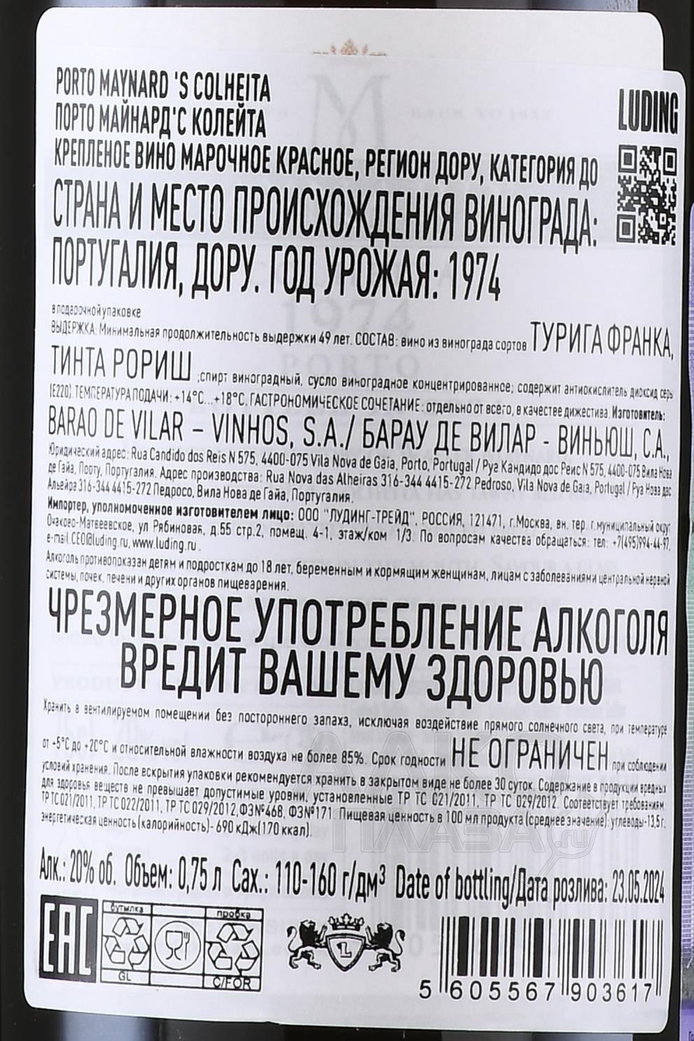 Портвейн Maynards Porto Colheita 1974 г. 0,75л в д/у относится к миллезимной категории — он создан из винограда одного урожая, собранного в долине Дору. Ягоды выращены на террасных склонах региона с преобладанием сланцевых почв и резким континентальным климатом, формирующим высокую концентрацию сырья. После ферментации процесс был остановлен добавлением винного спирта, что сохранило природную сладость. Далее вино длительно выдерживалось в использованных дубовых бочках не менее 49 лет. Созревание в древесине позволило сформировать мягкость, сложность и устойчивый баланс, сохранив свежесть несмотря на почтенный возраст. Каждая партия отбиралась индивидуально, с прицелом на элегантность и гармоничное развитие.