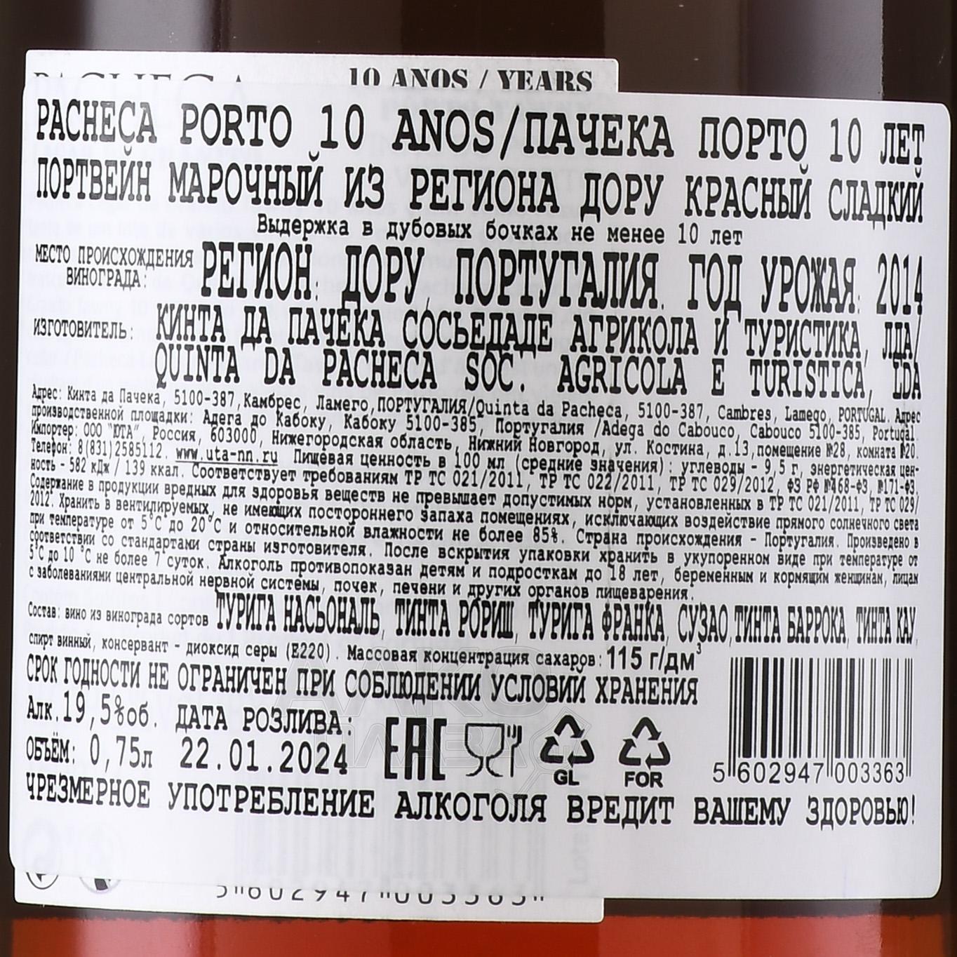Красный сладкий портвейн Pacheca Lagar de Granito Porto 10 лет 0,75 л в тубе создан в историческом хозяйстве, одном из старейших поместий Дору. Виноград для него собирают на крутых террасах субрегиона Baixo Corgo, где гранитные и сланцевые почвы дают плотные и концентрированные ягоды. Возраст лоз достигает 40–60 лет. Урожай собирают вручную. Базовое сусло проходит традиционное брожение в каменных лагарах, что помогает сохранить структуру и повысить ароматическую насыщенность сусла. Спиртование происходит в оптимальный момент, когда часть природного сахара ещё не переработана. Выдержка длится около десяти лет в бочках из португальского дуба. За это время напиток медленно развивается, приобретая сложность и сбалансированную сладость. Выпуск ограничен, так как для серии используют небольшие партии вина с лучшими органолептическими характеристиками.