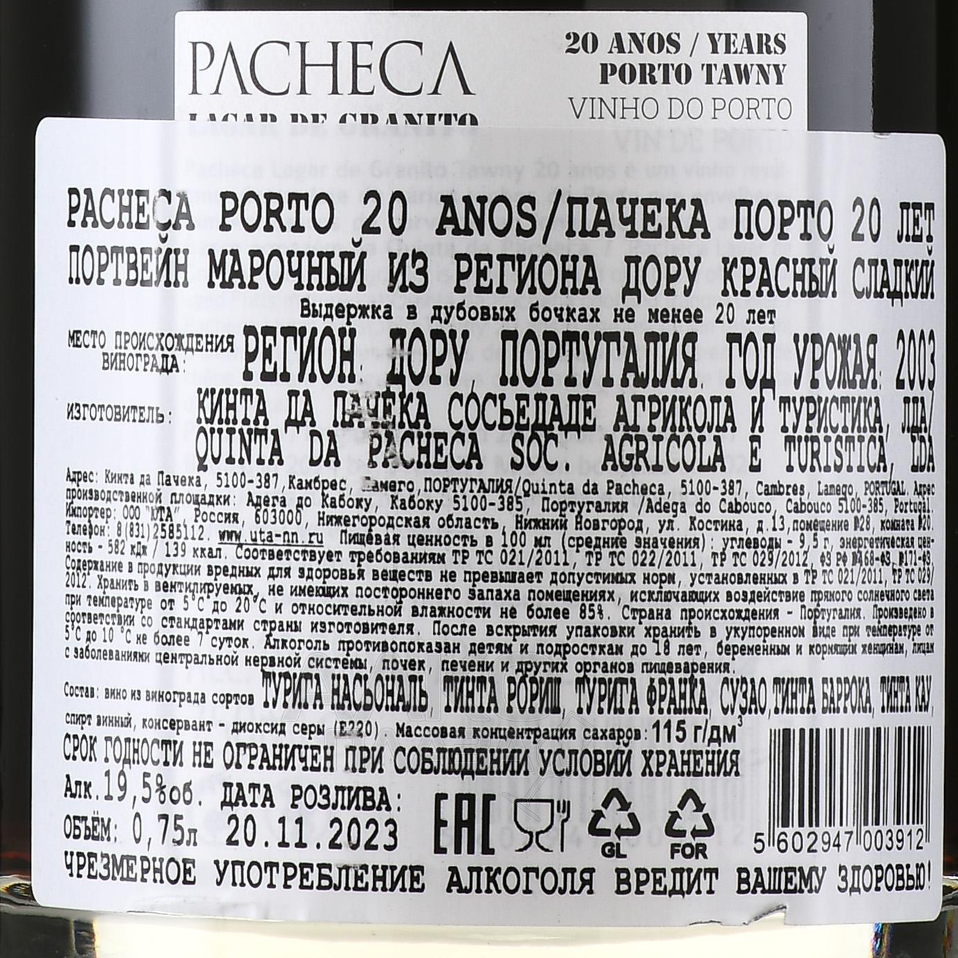 Красный сладкий портвейн Pacheca Lagar de Granito Porto 20 лет 0,75 л в тубе создаётся на основе винограда, выращенного на террасных участках реки Дору, где сланцевые и гранитные почвы формируют плотную структуру ягод и высокую естественную концентрацию. Лозы расположены на высотах от 80 до 300 метров, что позволяет сочетать тепло долины и более прохладный климат верхних склонов. Купаж выдерживается не менее двадцати лет в бочках из португальского дуба. Производитель использует традиционный метод дробления и ферментации в гранитных лагарах. Миксование партий проводится после долгой выдержки, чтобы добиться гармонии старения и свежих фруктовых мотивов. Плотная туба защищает напиток от света и подчёркивает его коллекционный статус.