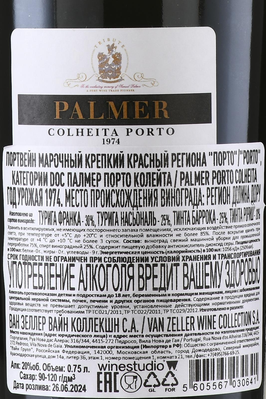 Портвейн Palmer Porto Colheita DOC 1974 года 0,75 л в тубе — это редкий образец винтажного порто в стиле колейта. Вино произведено в регионе Дору, где виноградники расположены на террасированных склонах с каменистой почвой, которая придает ягодам насыщенность и сложный вкус. Урожай 1974 года отличался хорошей зрелостью и балансом кислотности. Ферментация протекала в традиционных гранитных лагарах с последующей остановкой брожения добавлением виноградного дистиллята. После этого вино прошло выдержку в дубовых бочках, которая длилась несколько десятилетий. Такой процесс позволяет развивать сложный букет, мягкую текстуру и глубокий вкус. Этот портвейн ценится коллекционерами, неоднократно отмечался в специализированных изданиях и входит в число редких порто винтажного типа.