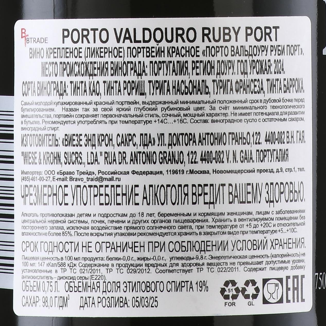 Porto Valdouro Ruby Port - портвейн Порто Вальдоуру Руби Порт 0.75 л красный