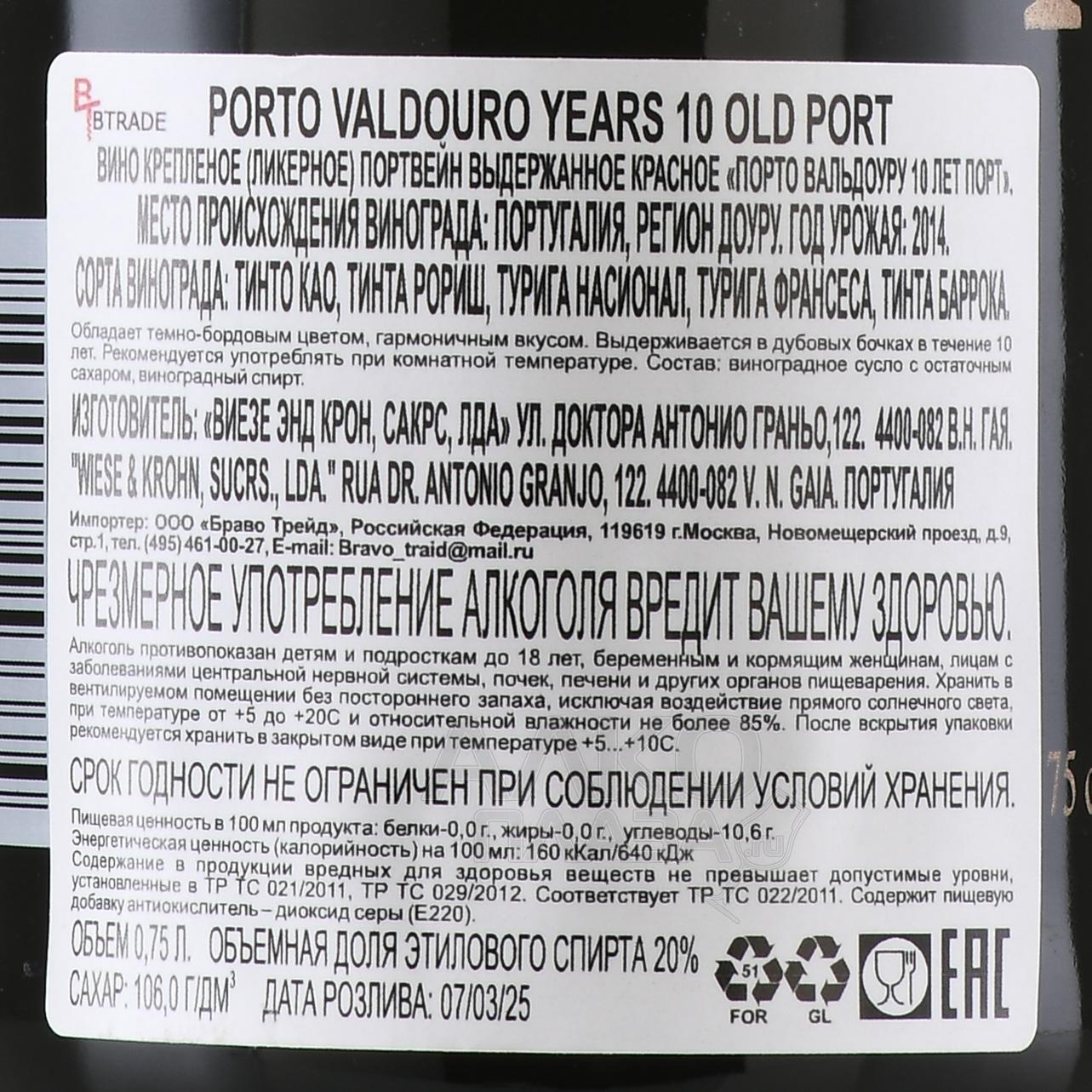 Портвейн Valdouro Porto 10 лет 0,75 л создан в классическом стиле выдержанных порто. Виноград произрастает на террасированных склонах Дору, где каменистые почвы и жаркий климат обеспечивают ягодам высокую концентрацию сахара и богатый вкус. После традиционной ферментации с добавлением виноградного дистиллята процесс останавливается, что позволяет сохранить естественную сладость. Вино выдерживается в дубовых бочках не менее десяти лет, благодаря чему приобретает сложный аромат, мягкие тона и бархатистую текстуру. Уникальность выражается в гармонии зрелости и свежести, а также в стабильных высоких оценках специалистов, которые отмечают сбалансированный стиль этого портвейна.