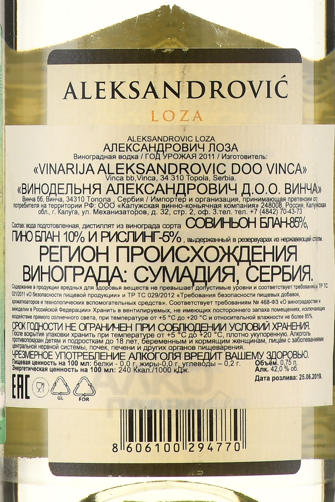 Aleksandrovic Loza - ракия Лоза Александрович 0.75 л