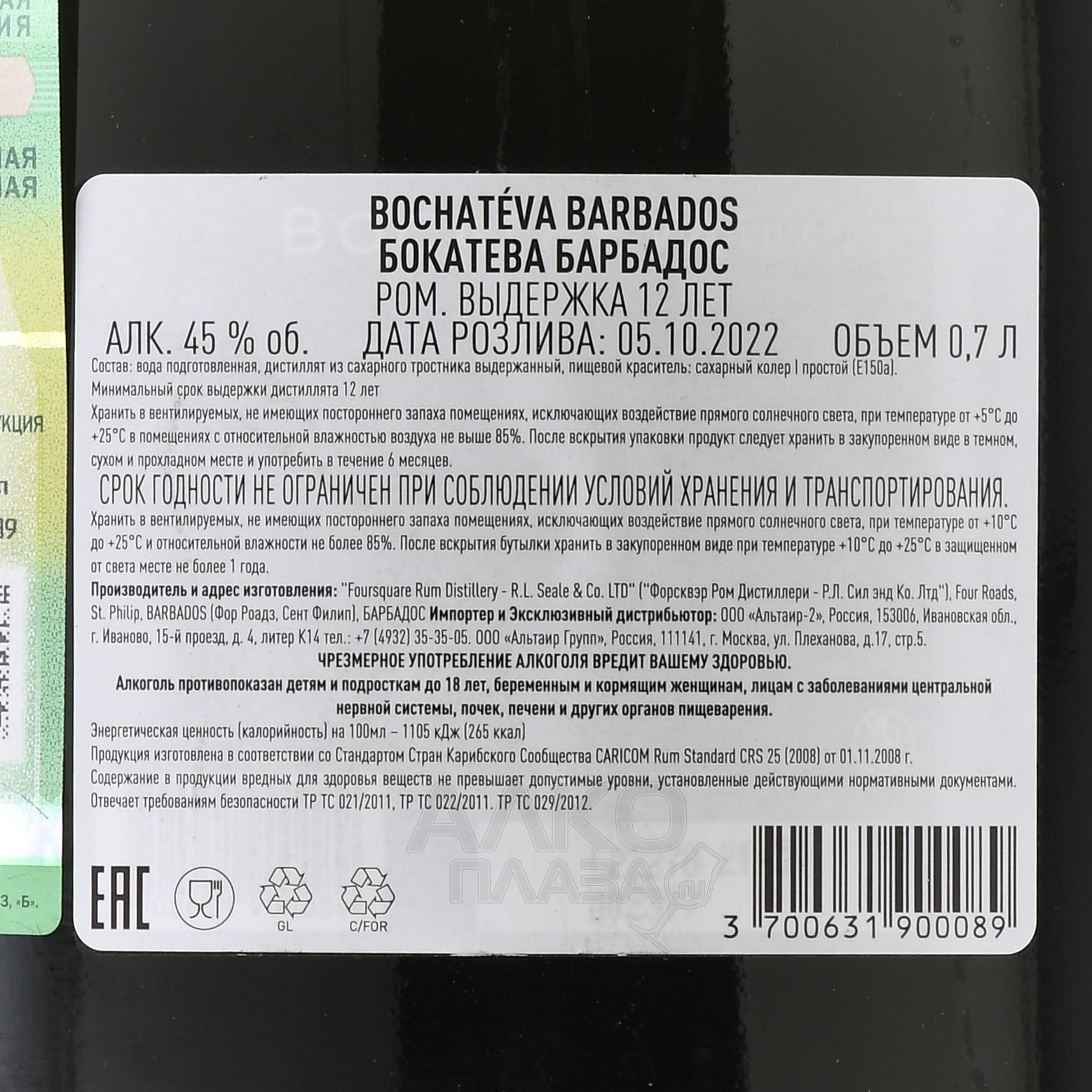 Ром Bocatheva 12 Years Old — выдержанная вариация островного рома, которая предлагается при крепости выше стандартной (45%). Ее изготавливают на территории Барбадоса из мелассы местного сахарного тростника по технологии перегонки в специальном котле. Также напиток проходит 12-летнее вызревание в дубовых бочонках повторного наполнения, которые ранее использовались для бурбона.