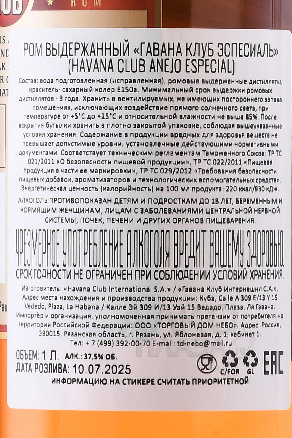 Ром Havana Club Anejo Especial 1 л — кубинский золотой сорт категории premium. Для него были отобраны вручную дистилляты с минимальным возрастом 3 года. Составленный купаж затем долго дозревал в бочонках из молодого, необожженного белого американского дуба. Итоговый срок выдержки составил более 5 лет. Благодаря необычной технологии, ром приобрел незаурядный богатый вкусоаромат.