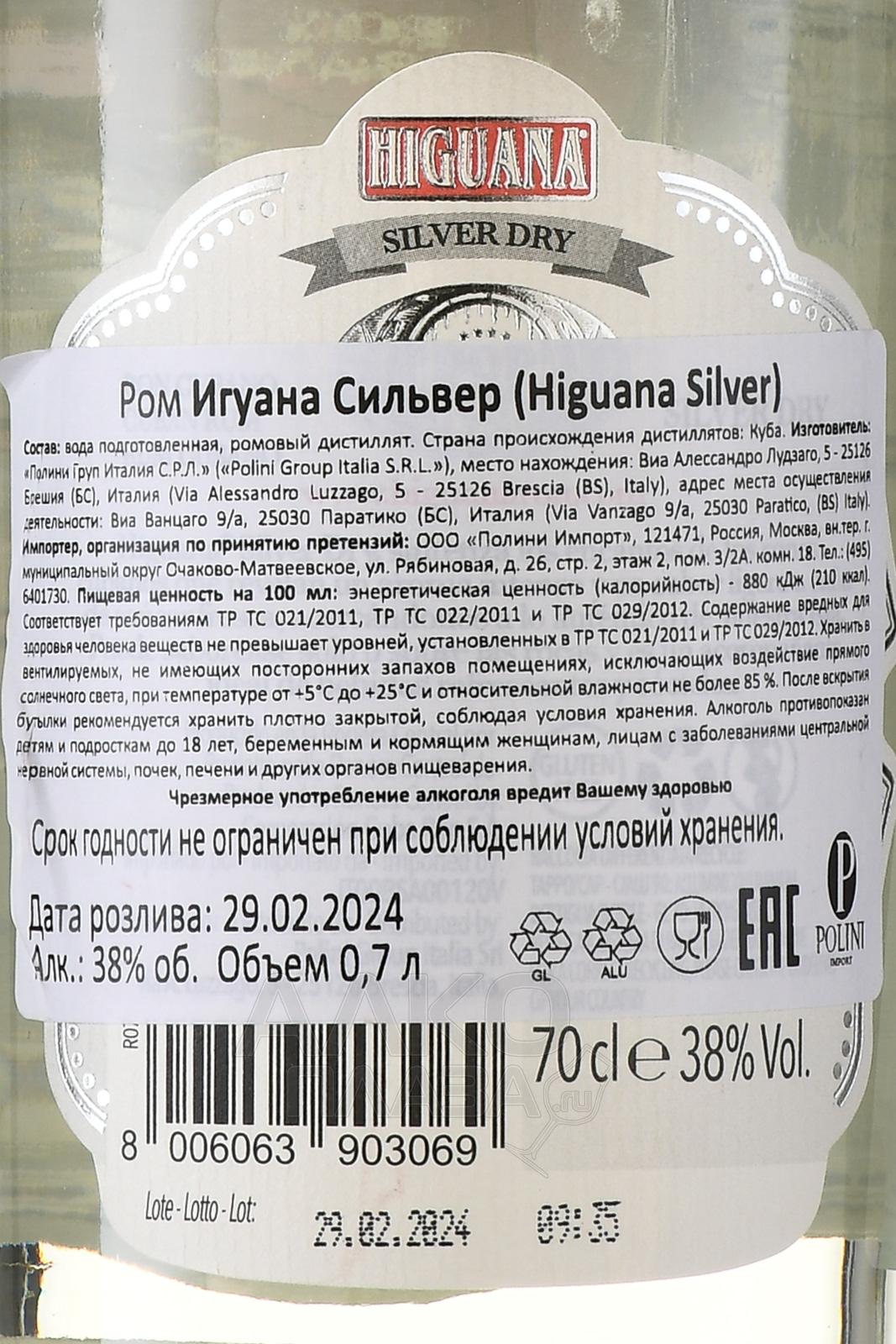 Ром Higuana Silver 0,7 л – молодой белый образец крепостью 38%, бесцветный и прозрачный. Его производят из отборной тростниковой меласс. Для купажа используют спирты разного возраста, изготовленные на Барбадосе по кубинской технологии. Затем напиток транспортируют в Испанию, где смешивают и разливают на мощностях компании Vittone 1842 S.l.u., входящей в Polini Group. Этот напиток создан как универсальный – он прекрасно подходит для коктейлей. Нейтральный профиль делает Higuana Silver удобной основой для миксов, будь то Mojito, Daiquiri или Cuba Libre.
