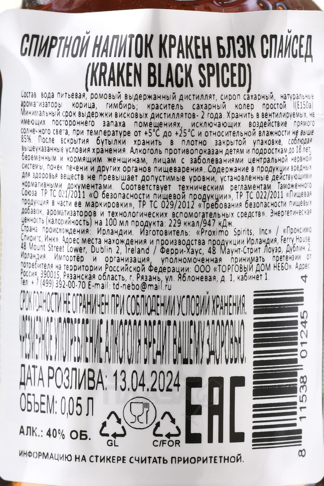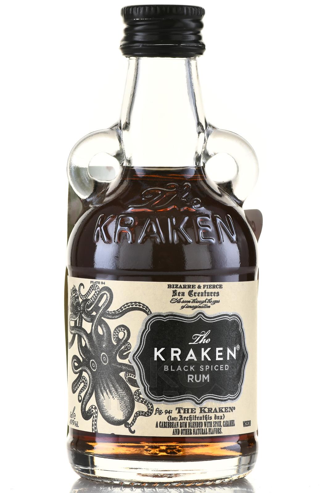 Ром Kraken Black Spiced 0,05 л — темный пряный сорт премиальной категории. Он производится на основе тропического рома из Молласэс (Тринидад и Тобаго), выдержанного 1–2 года в дубовых бочках. Яркость вкусу придает смесь специй, среди которых корица, гвоздика, имбирь и другие. Напиток разлит в миниатюрную бутылку с эффектным дизайном в викторианском стиле, с полукруглыми ручками и чёрн-белой этикеткой с изображением гигантского кальмара-кракена — повелителя глубин и символа несокрушимой силы. Этот ром получил серебряную медаль и 89 баллов из 100 от Beverage Testing Institute. Impact magazine включил марку Kraken в список “Hot Brands”. Критики отмечают сложный профиль и выразительный аромат напитка. Вариант в мини-бутылке — отличный выбор для знакомства с пряным сортом.