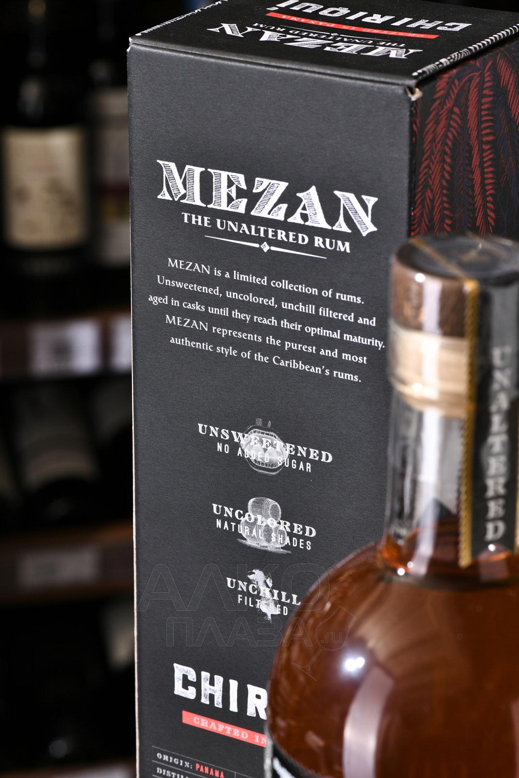 Ром Mezan Chiriqui в бутылках 700-миллилитрового формата, которые сопровождаются сувенирными картонными боксами, имеет сорокаградусную крепость и натуральный состав, представленный тростниковыми дистиллятами из Панамы. Изготовление осуществилось путем классической перегонки, после чего спирты поместили выдерживаться в бочонки, где ранее находился бурбон. Финишная отделка прошла в ценных барриках из-под вина.