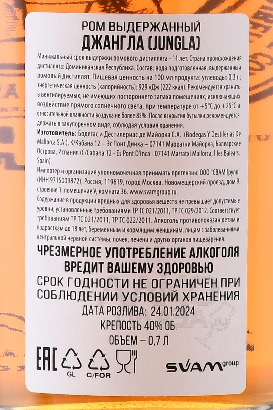 Ron Jungla 0,7 л — напиток доминиканского происхождения, созданный из основе сахарного тростника, который выращивается в условиях жаркого и влажного тропического климата. Высокие температуры и интенсивное солнце способствуют быстрому накоплению сахаров в сырье, что напрямую отражается на мягкости и округлости вкуса. После первичной выдержки в Карибском бассейне спирты проходят вторичное созревание в Европе. Дополнительная выдержка осуществляется на острове Майорка в бочках из-под бренди хозяйства Bodegas Suau. Этот этап придаёт спиртному более сложный профиль и усиливает глубину аромата. Минимальный возраст дистиллятов в составе купажа — 11 лет.