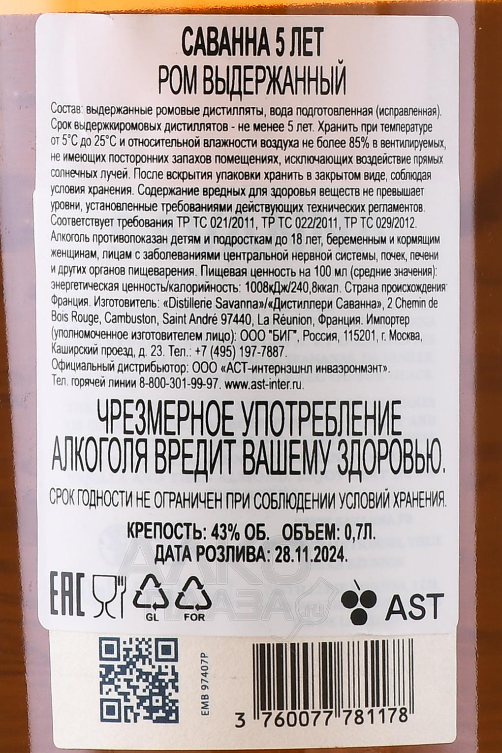 Savanna 5 years Old - ром Саванна 5 лет 0.7 л в п/у