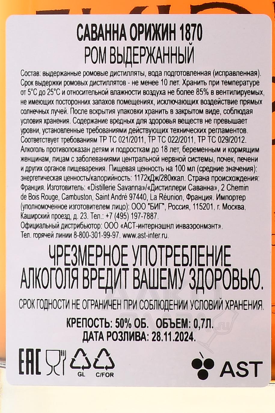 Savanna Origine 1870 - ром Саванна Орижин 1870 0.7 л в п/у