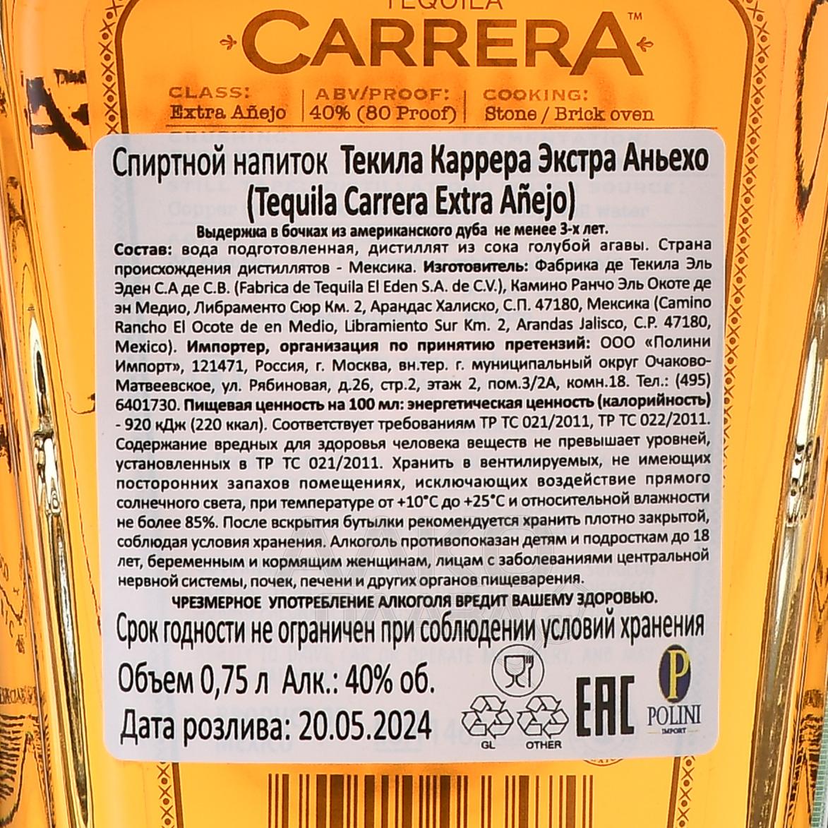 Текила Carrera Extra Anejo 0,75 л в п/у — это выдержанный мексиканский дистиллят, произведённый в регионе Арандас штата Халиско. Она изготовлена из 100% голубой агавы сорта Weber, выращенной на красных вулканических почвах. Плоды сначала запекают в традиционных каменных и кирпичных печах, затем измельчают с помощью вальцовой мельницы. Ферментация проводится в стальных резервуарах с использованием воды из глубоких скважин, а двойная дистилляция сброженного сусла — в медных кубах. завершение следует долгая — на протяжении 56 месяцев — выдержка в бочках из американского белого дуба, в процессе которой напиток приобретает выразительный и неповторимый характер.