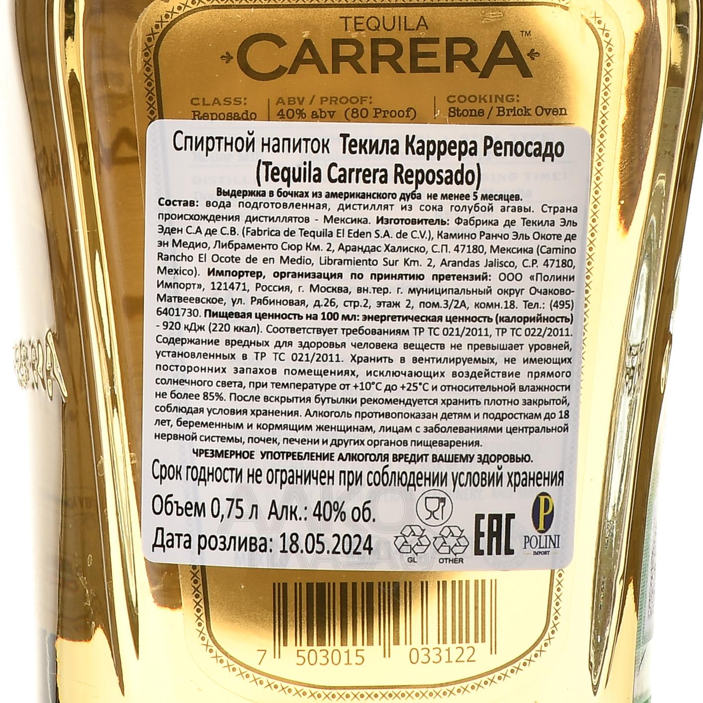 Текила Carrera Reposado 0,75 л в подарочной упаковке — это мексиканский дистиллят, изготовленный в традиционном стиле. Агава, плоды которой используются в качестве сырья для производства, выращивается в высокогорьях штата Халиско, где перепады температур и вулканические почвы способствуют накоплению сахаров в сердцевинах. Сбор осуществляется вручную. Затем пиньи медленно запекают в печах, чтобы сохранить природную сладость, а отжатый из них сок ферментируют и дважды перегоняют в медных аламбиках. Выдержка продолжается не менее двух месяцев в дубовых бочках, придавая напитку характерные ноты ванили и карамели.