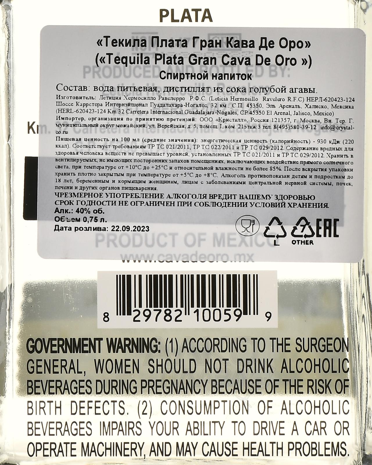 Gran Cava De Oro Plata - текила Гран Кава Де Оро Плата 0.75 л