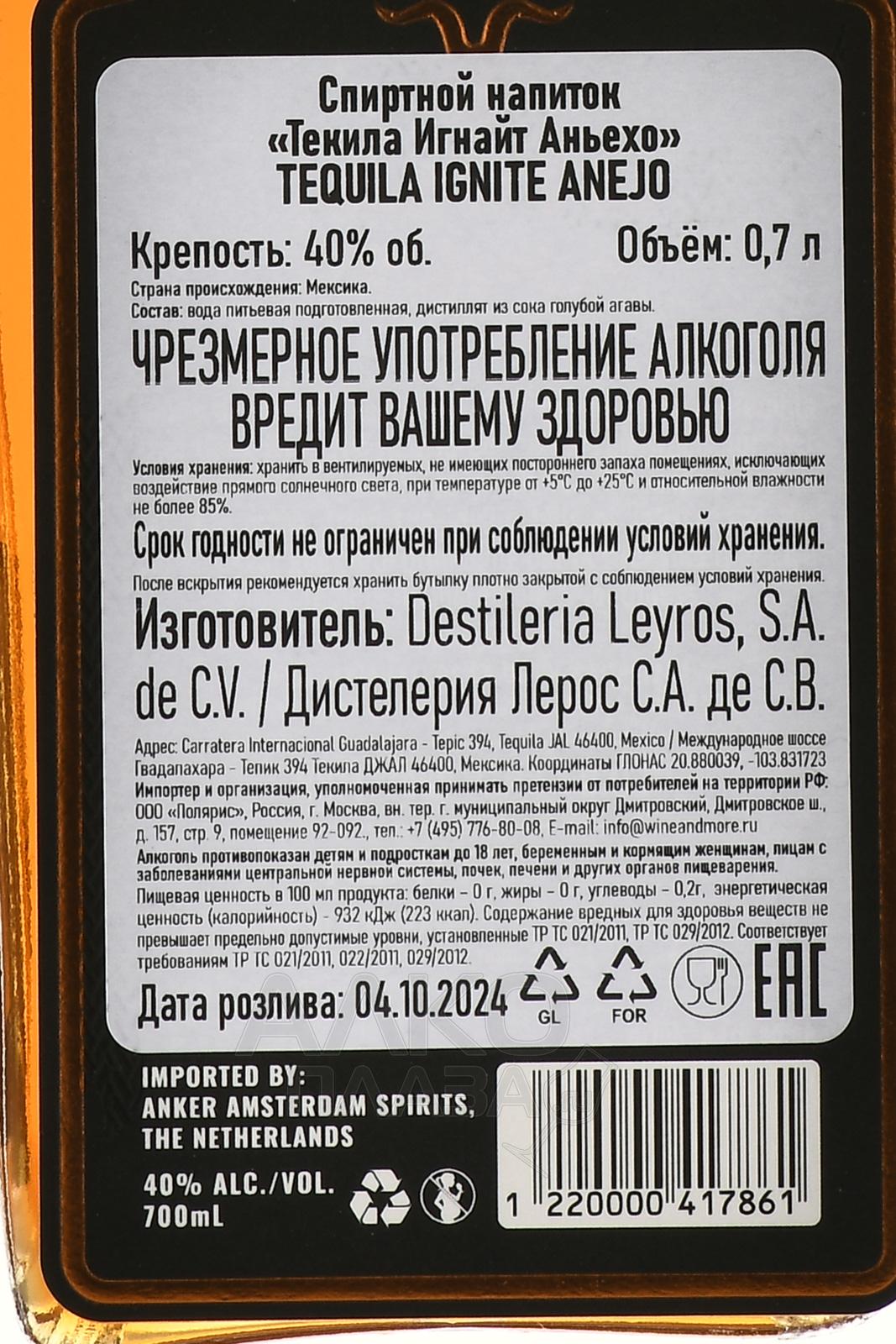 Текила Ignite Anejo 0,7 л — выдержанный напиток премиум-класса, который создают из 100% голубой агавы сорта Blue Weber. Пиньи медленно запекают, добиваясь содержания сахара не менее 24%. После ферментации следует двойная дистилляция. Выдержка проходит более 12 месяцев в новых бочках из американского дуба, что придает дистиллятам насыщенный вкус и глубокий янтарный цвет. Особенность релиза заключается в тщательно подобранных бочках, которые передают текиле акценты ванили, корицы и древесных специй. В 2023 году образец получил платиновую награду Sip Awards и 98 баллов от Major League Spirits, а также бронзовые медали на конкурсах в Сан-Франциско, Лос-Анджелесе и Нью-Йорке.