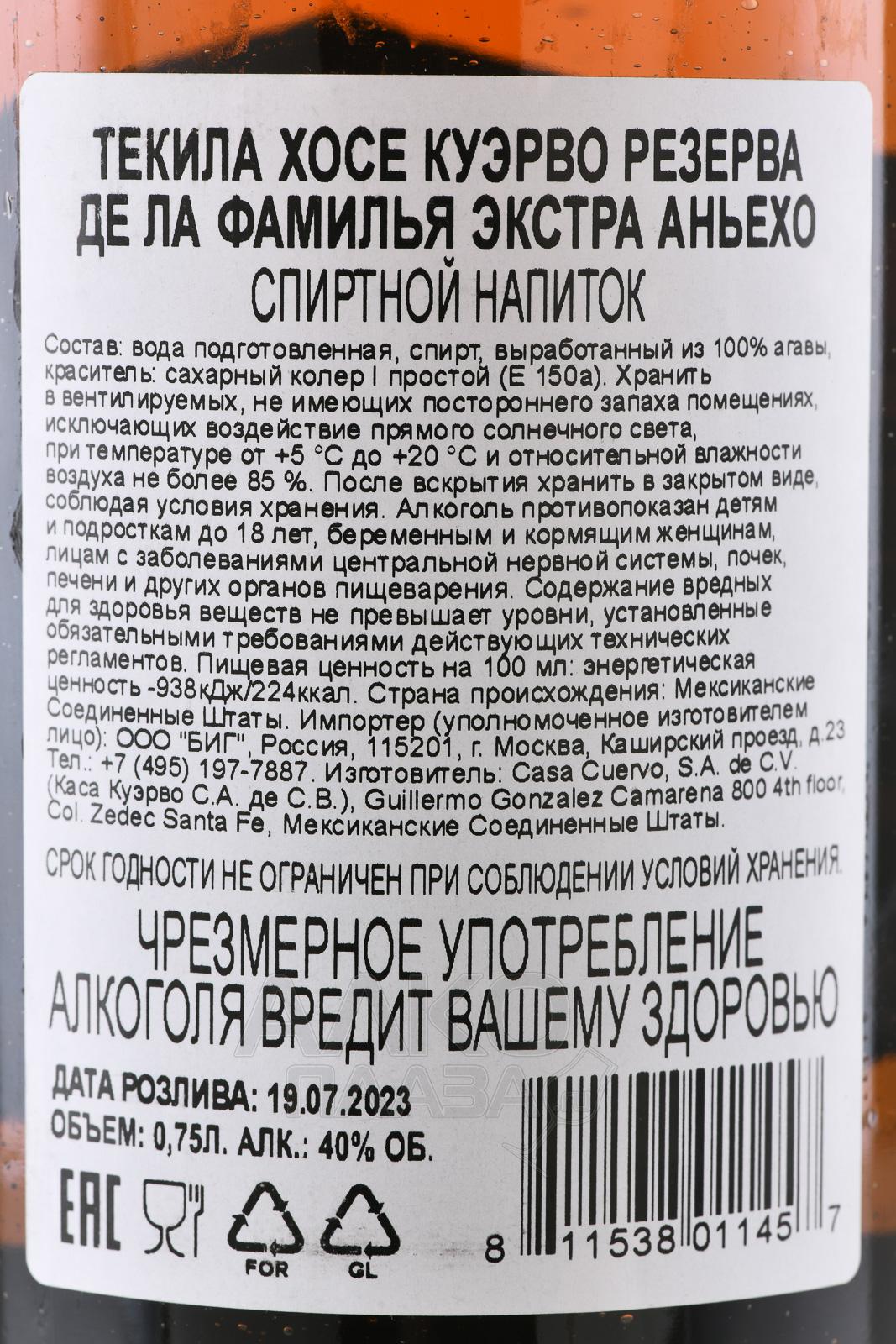 Текила Jose Cuervo Reserva de la Familia Extra Anejo 0,75 л в д/у – выдержанное спиртное, изготовленное в соответствии с традиционной мексиканской рецептурой. Это самый зрелый сорт из классической линейки семейного бренда Хосе Куэрво. Напиток сделан полностью из аборигенной голубой агавы методом брожения и дистилляции. После перегонки спирты созревали на протяжении долгого времени, в результате чего приобрели сложный и насыщенный вкусоаромат. Отмеченная наградами вариация предлагается в деревянном кейсе. Это отличный подарок по особому случаю.