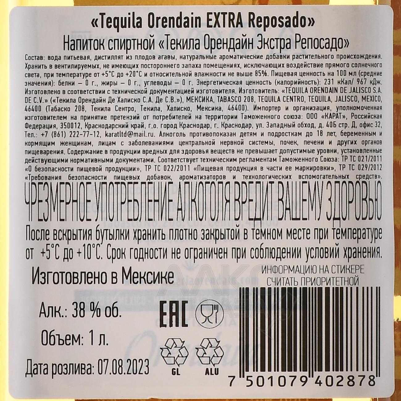 Текила Orendain Extra Reposado 1 л – премиальный сорт спиртного от старинного мексиканского производителя. Напиток изготавливается практически полностью вручную. Для его создания отбирают лучшие плоды голубой агавы, созревшие в районе Лос Валлес штата Халиско, на высоте более 1500 метров над уровнем моря. Сырье запекают в каменной печи, измельчают и сбраживают. После ферментации в стальных резервуарах сусло дважды дистиллируют в стальных и медных перегонных кубах, после чего спирты отдыхают в течение 3 месяцев в бочках из американского белого дуба.