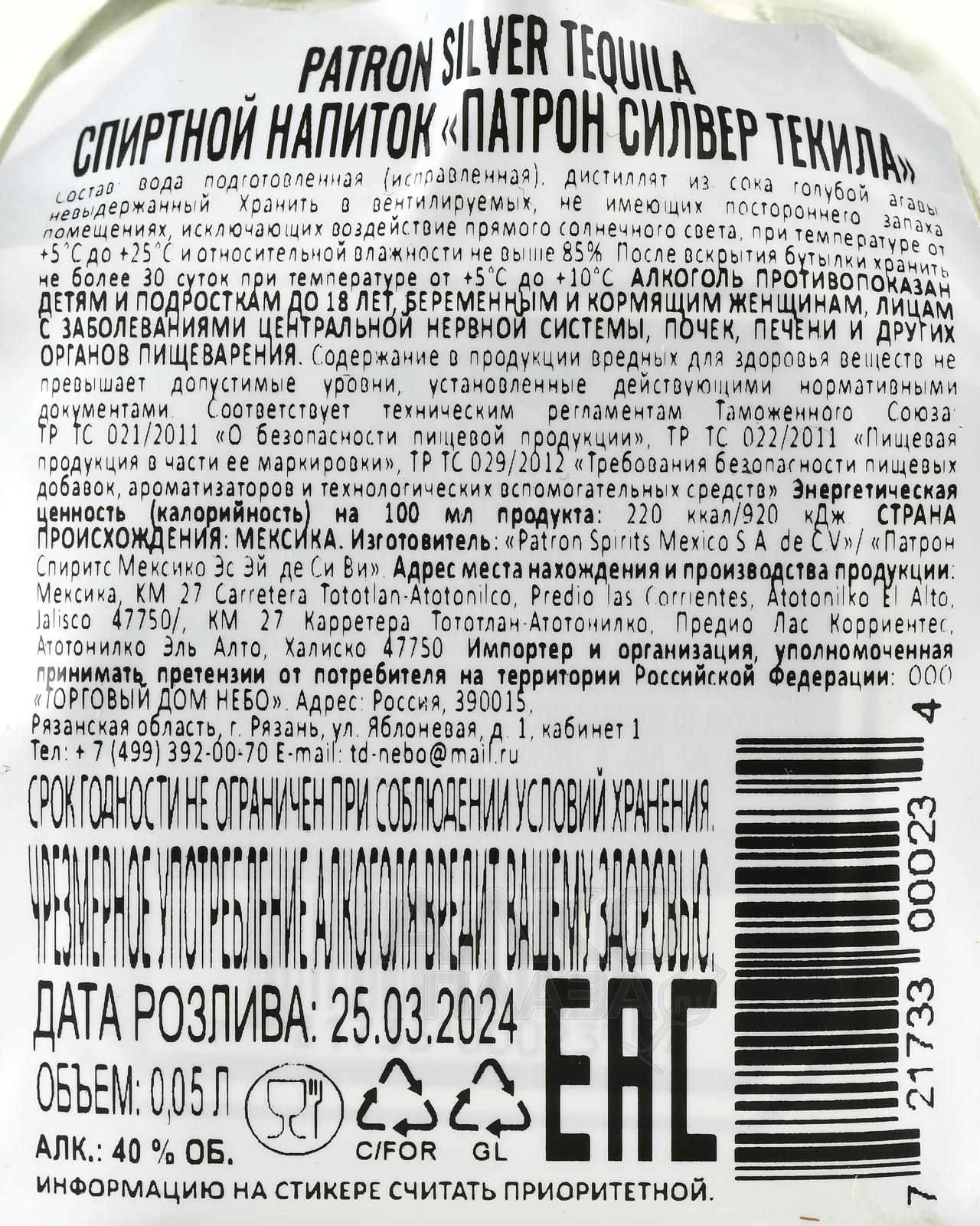 Текила Patron Silver 0,05 л — вариация в миниатюрной бутылочке, которая представляет интерес прежде всего для алкоминималистов. В таком оригинальном формате выпущен флагманский сорт из коллекции всемирно известного бренда. Напиток изготовлен из 100% голубой агавы Вебера, которая произрастает на высокогорье в штате Халиско. Дистиллят получают путем перегонки в небольших кубах и не подвергают выдержке. Серебряный сорт элитной текилы имеет крепость 40%.