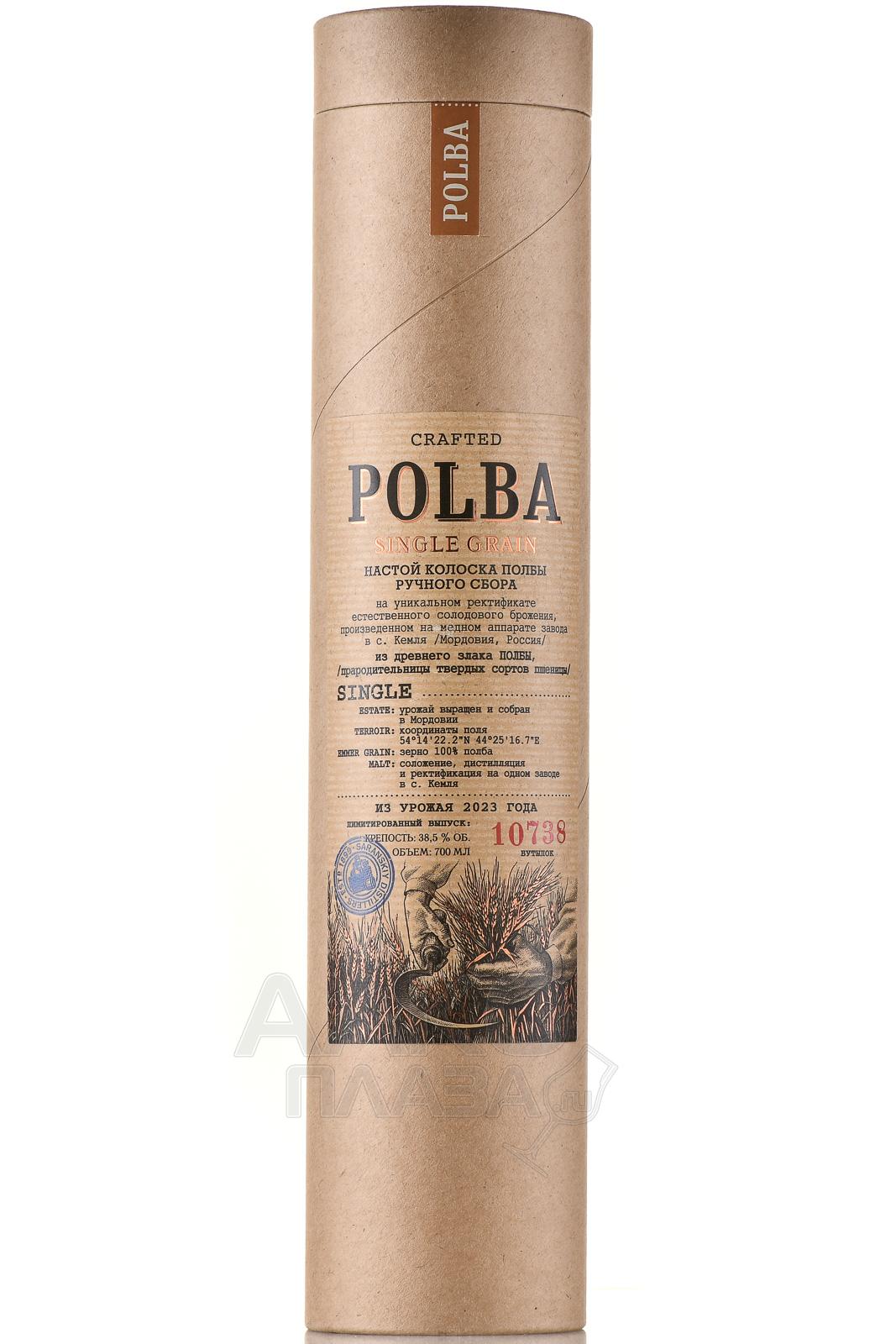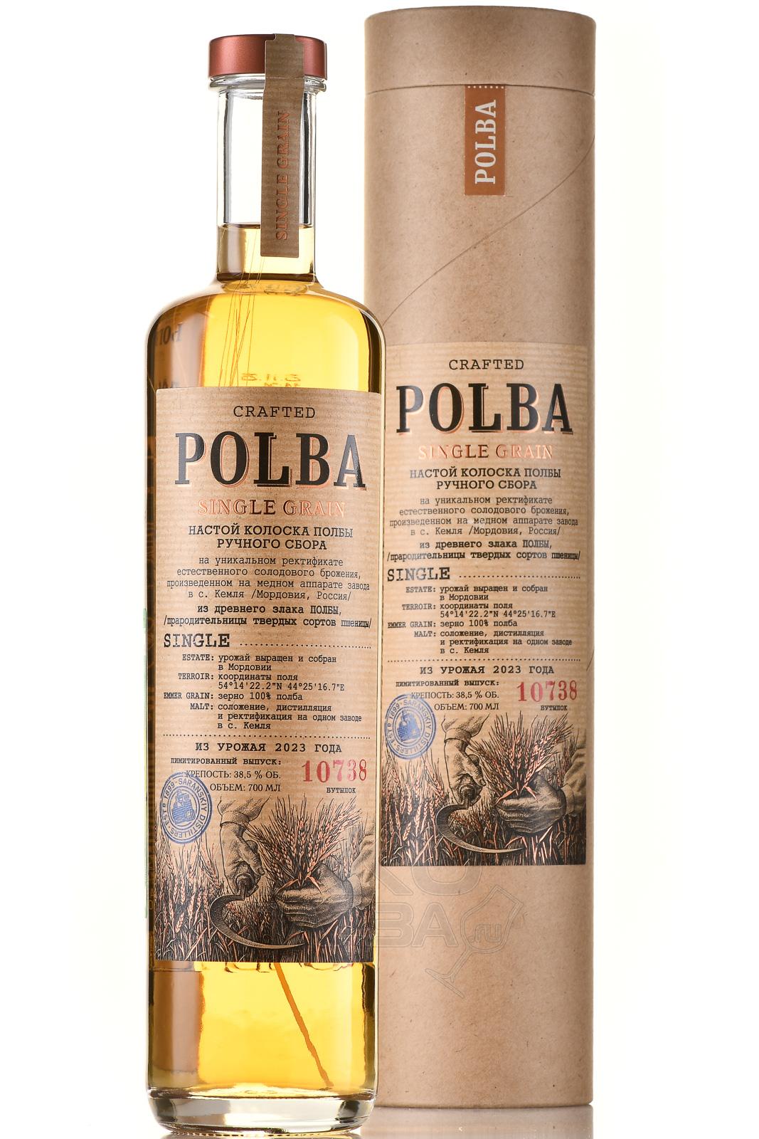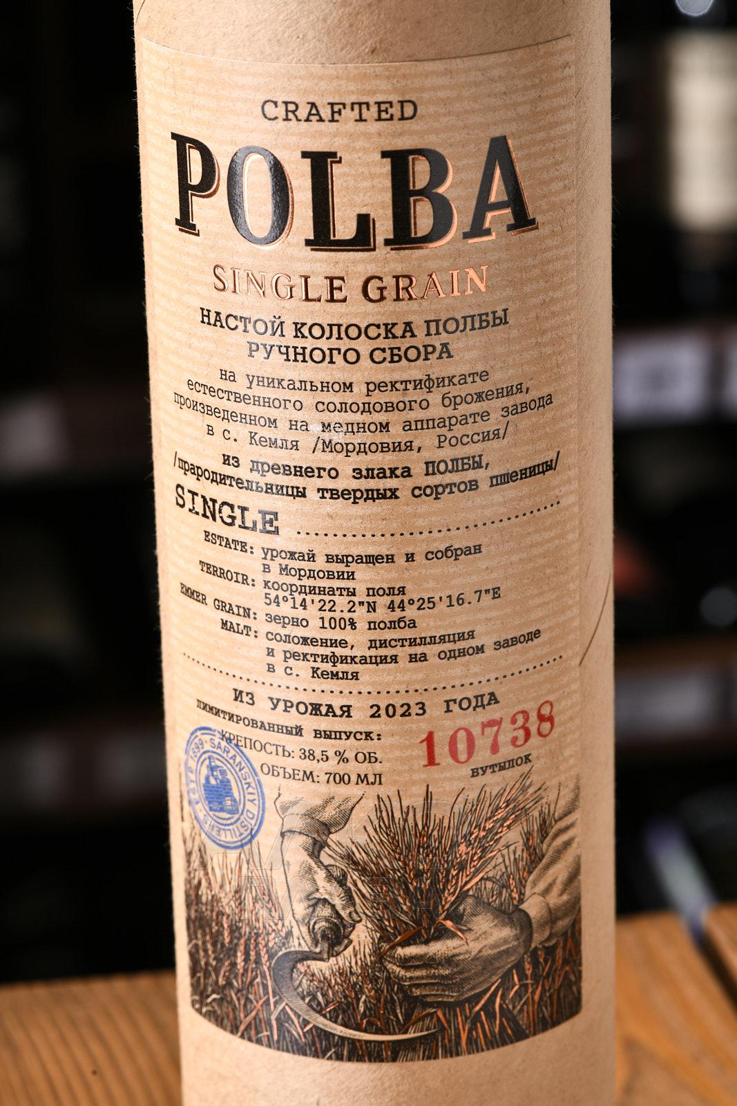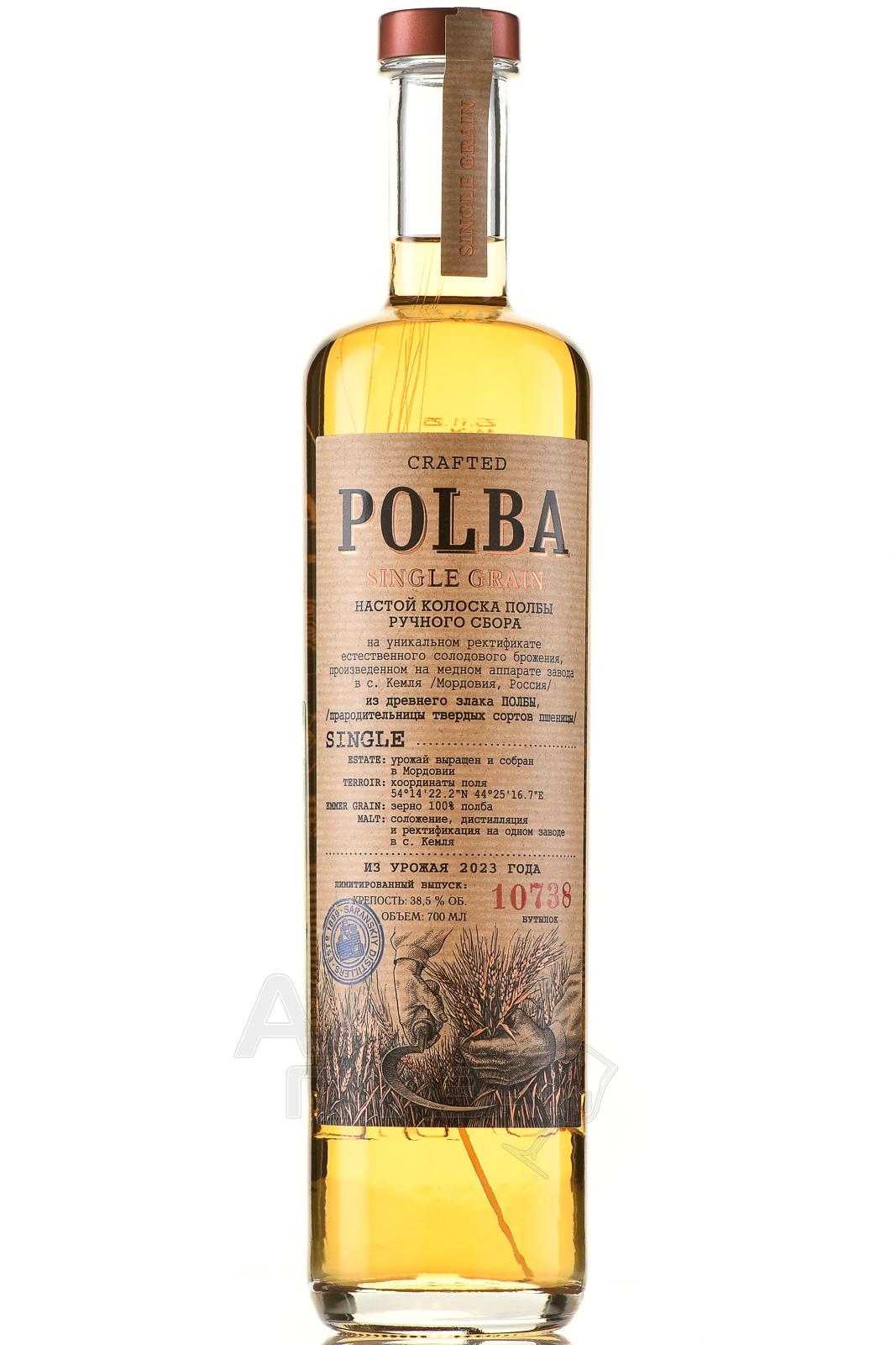 Настойка Полба на колосках ручного сбора 0,7 л в тубе изготовлена на основе древнего злака полбы. Используется зерно ручного сбора. Сырьё выращено и собрано в Мордовии, с поля с координатами 54°14′22.2″N 44°25′16.7″E. Основа — уникальный ректификат естественного солодового брожения. Производственный цикл включает соложение, дистилляцию и ректификацию, выполненные на одном заводе в селе Кемля. Перегонка осуществляется на медном аппарате. В составе применяется исключительно зерно полбы, без добавления ароматизаторов. Урожай относится к 2023 году. Напиток выпущен ограниченной серией в количестве 10738 бутылок.