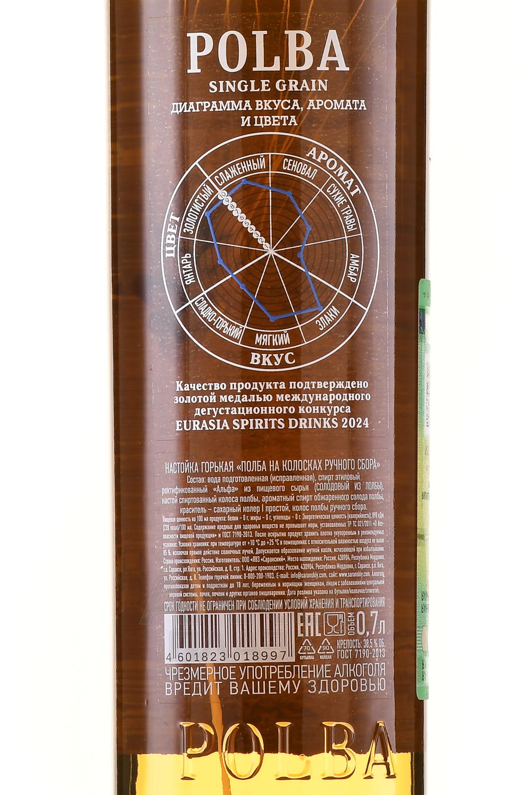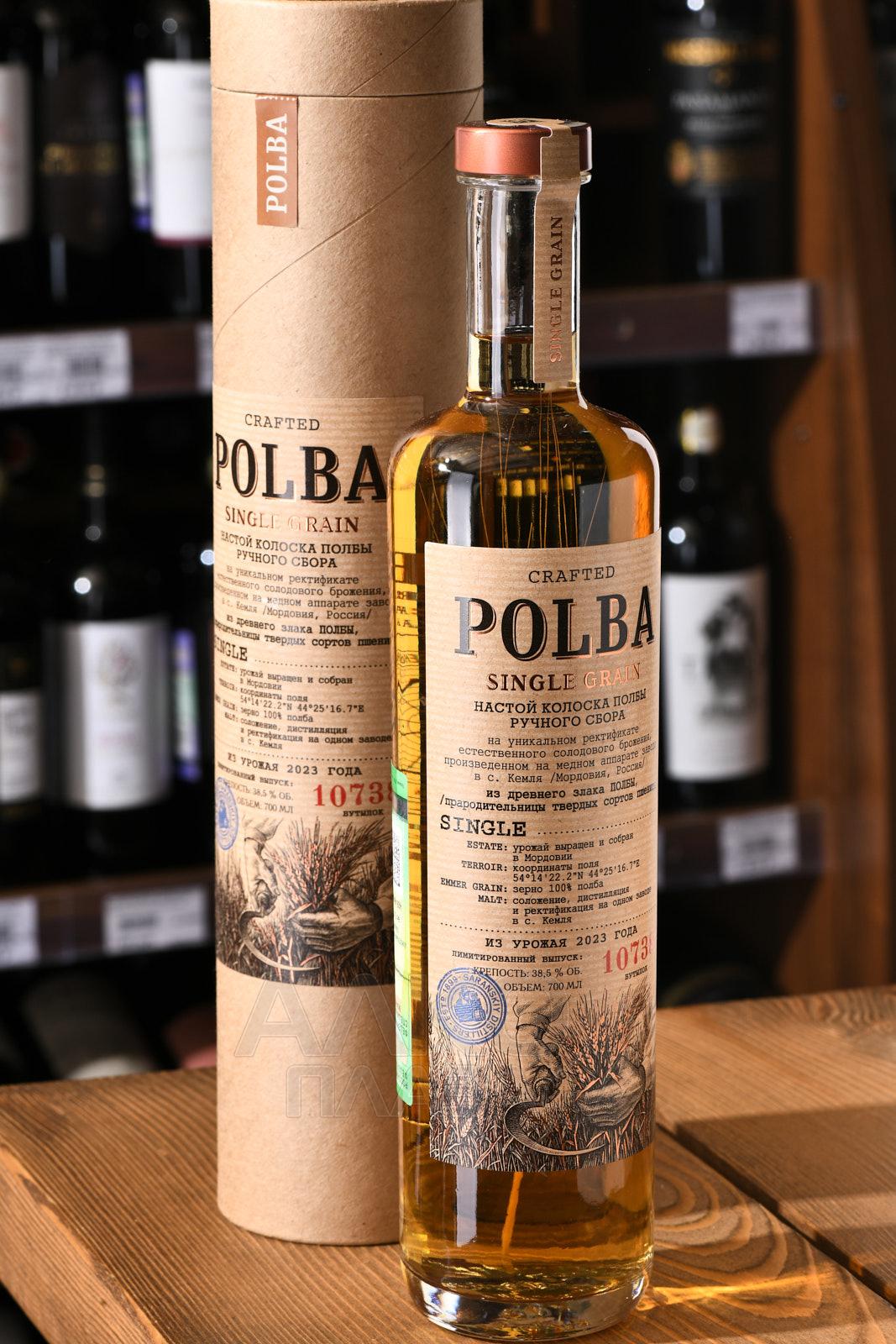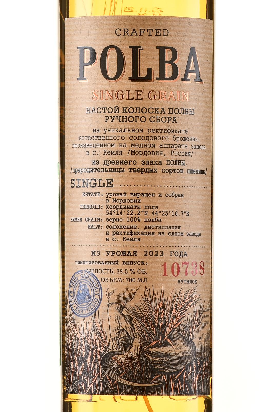 Настойка Полба на колосках ручного сбора 0,7 л в тубе изготовлена на основе древнего злака полбы. Используется зерно ручного сбора. Сырьё выращено и собрано в Мордовии, с поля с координатами 54°14′22.2″N 44°25′16.7″E. Основа — уникальный ректификат естественного солодового брожения. Производственный цикл включает соложение, дистилляцию и ректификацию, выполненные на одном заводе в селе Кемля. Перегонка осуществляется на медном аппарате. В составе применяется исключительно зерно полбы, без добавления ароматизаторов. Урожай относится к 2023 году. Напиток выпущен ограниченной серией в количестве 10738 бутылок.