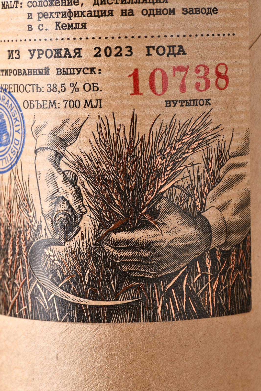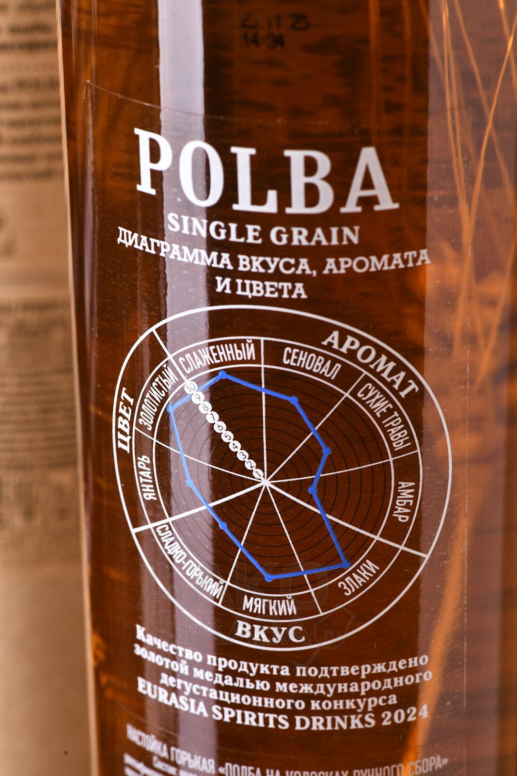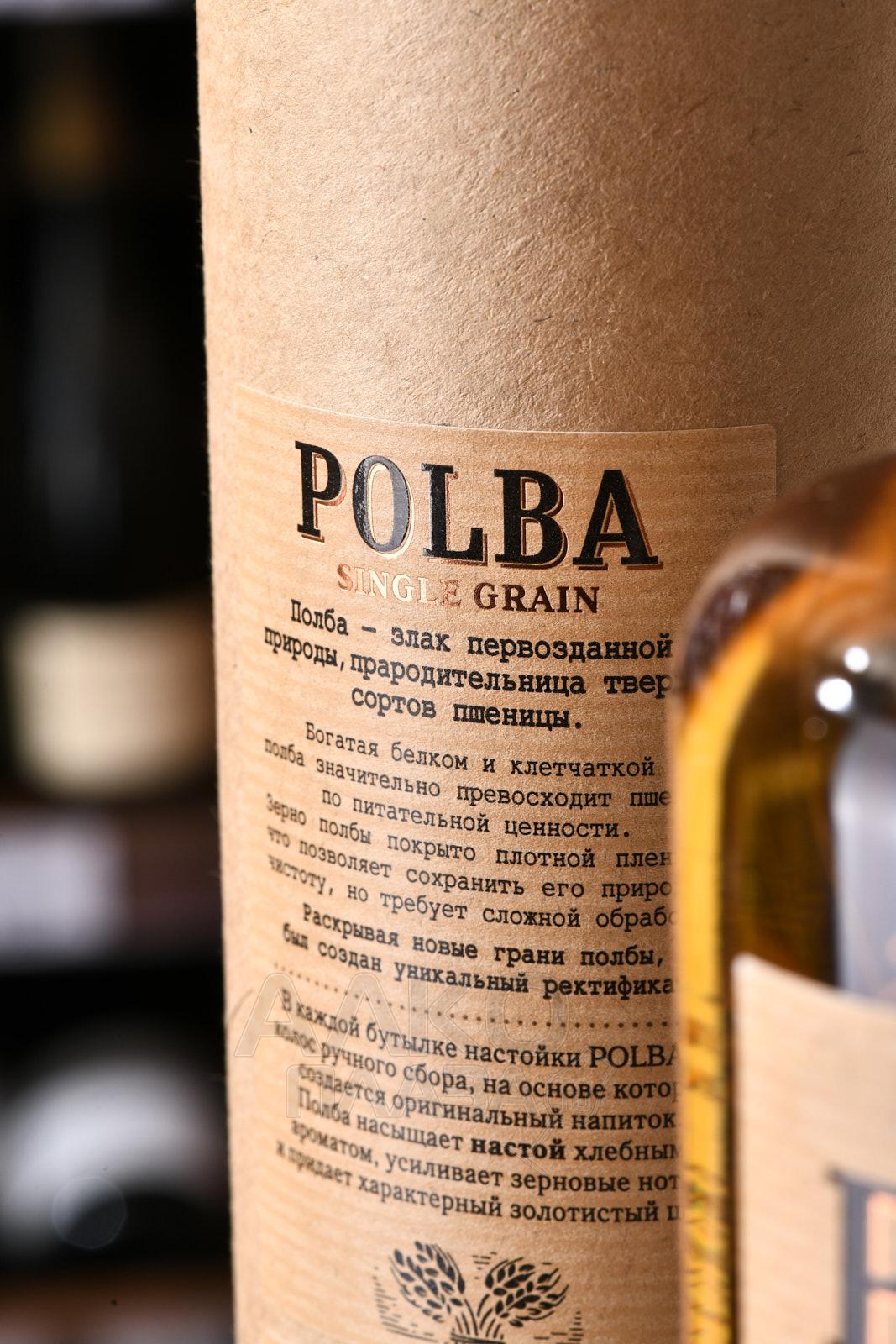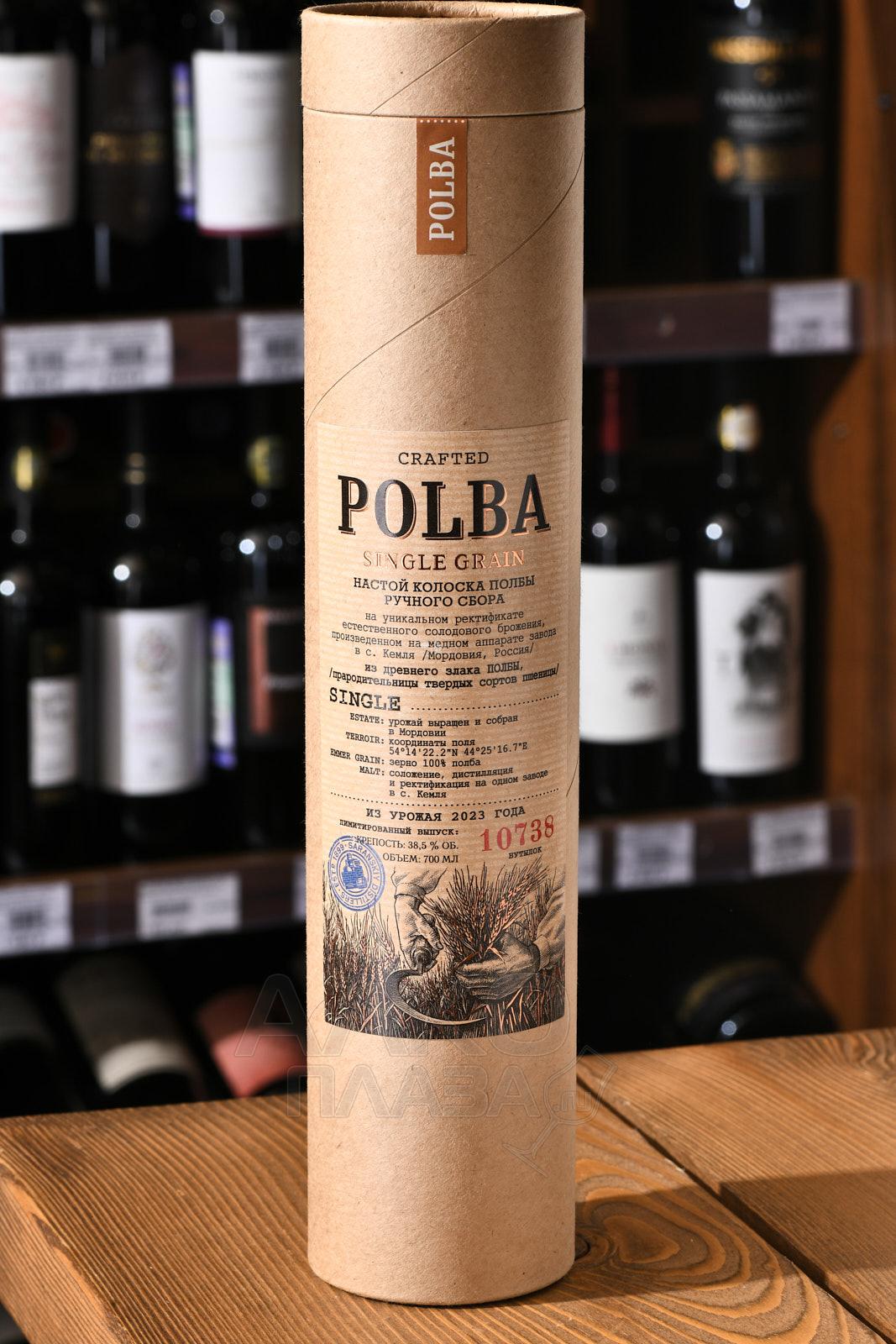 Настойка Полба на колосках ручного сбора 0,7 л в тубе изготовлена на основе древнего злака полбы. Используется зерно ручного сбора. Сырьё выращено и собрано в Мордовии, с поля с координатами 54°14′22.2″N 44°25′16.7″E. Основа — уникальный ректификат естественного солодового брожения. Производственный цикл включает соложение, дистилляцию и ректификацию, выполненные на одном заводе в селе Кемля. Перегонка осуществляется на медном аппарате. В составе применяется исключительно зерно полбы, без добавления ароматизаторов. Урожай относится к 2023 году. Напиток выпущен ограниченной серией в количестве 10738 бутылок.