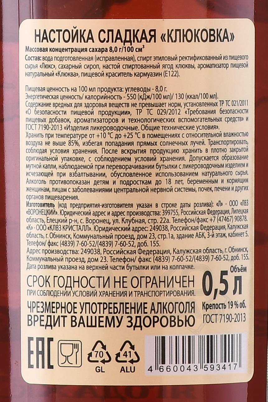 Настойка сладкая Клюковка 0.5 л характеризуется насыщенным характером и мягким вкусом, который был достигнут благодаря использованию отборных северных ягод. Сырье проходило естественную мацерацию в спиртовой основе, что позволяло извлечь максимум натуральных красителей, кислот и ароматических масел. В процессе производства применялась традиционная технология настаивания без добавления искусственных ароматизаторов, что сохранило природную свежесть и лёгкую терпкость клюквы. Напиток выдерживался в условиях, способствующих гармонизации вкуса и достижению тонкого баланса между сладостью и характерной ягодной кислинкой.