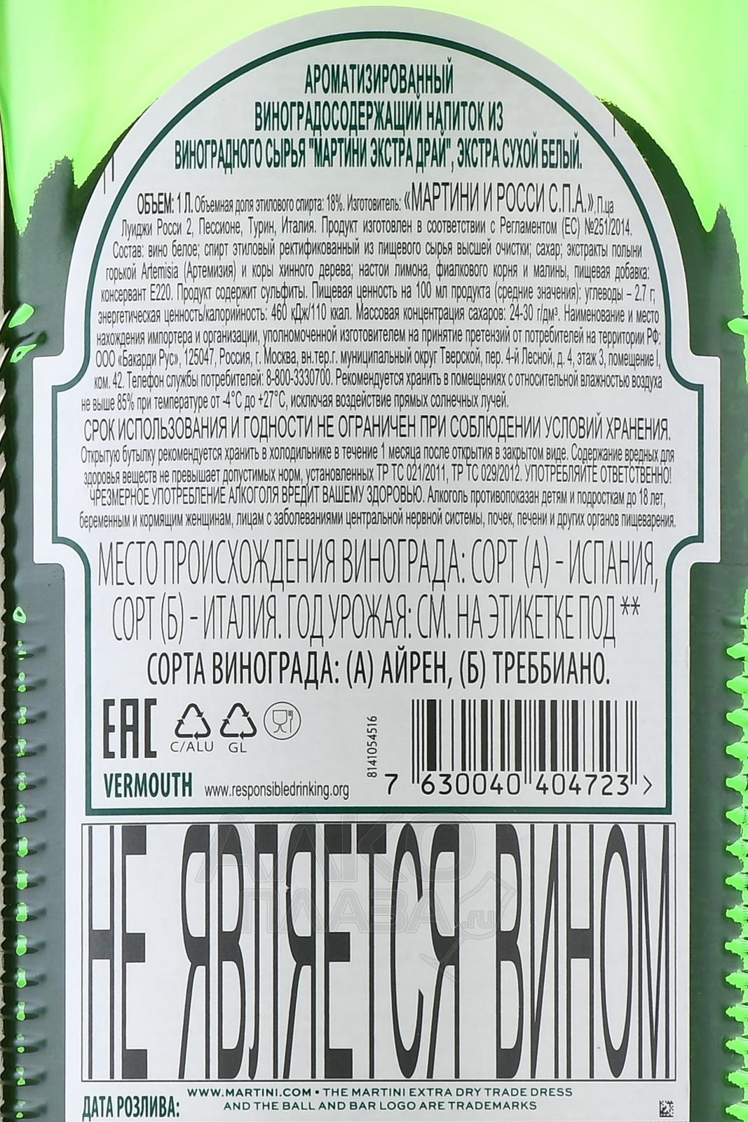 Вермут Martini Extra Dry 1 л идеален для коктейлей, а также в роли аперитива в чистом виде. Экстра-сухая белая разновидность — самая популярная в линейке Мартини, поэтому производитель выпустил ее в бутылке увеличенного объема. Версия отличается солидной крепостью — 18%, а содержание сахара составляет 2,7 г на 100 мл. Вермут создан на основе вина из сортов Айрен и Треббиано (выращиваются в итальянском Пьемонте) и мастерски подобранной композиции ботаникалов (полынь, кора хинного дерева, фиалковый корень, малина). Напиток получил множество престижных наград.