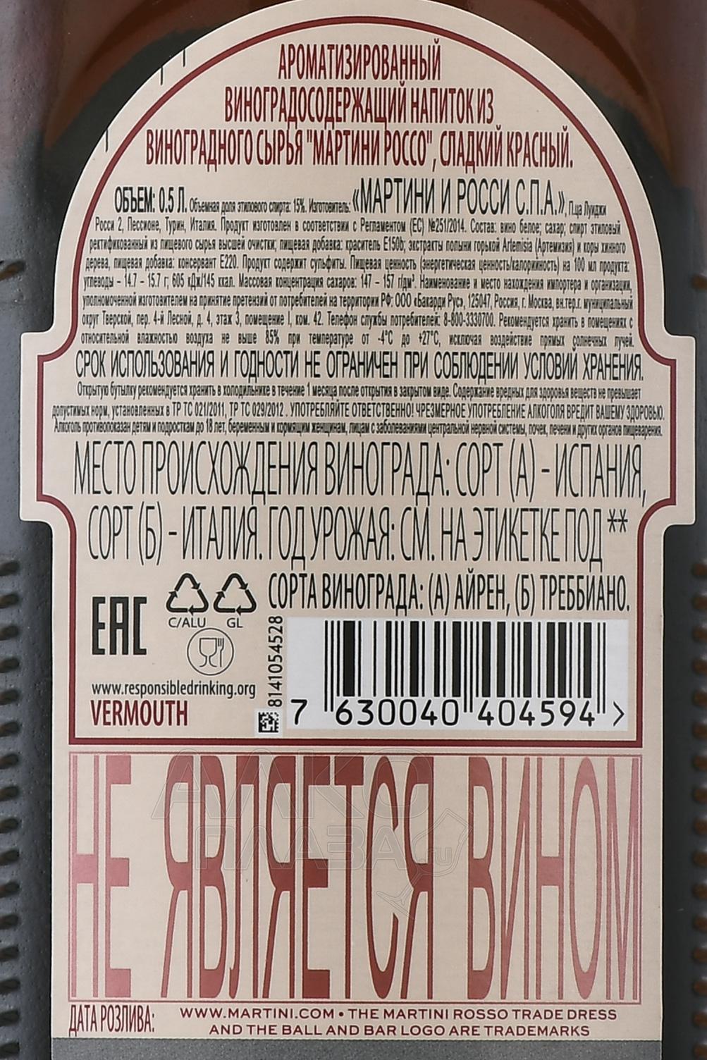 Martini Rosso — вермут насыщенного тёмно-янтарного цвета с мощной ароматикой. Вкус терпкий, заметна горечь которая сглаживается сладостью. Подавать в чистом виде, с соками, либо в составе различных коктейлей.