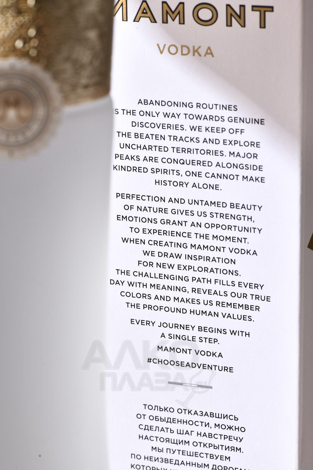 «Мамонт» – водка премиум-класса крепостью 40%. Отличается идеальной прозрачностью и мягким вкусом с нотами кедровых орехов. Напиток расфасовывают в бутылки матового стекла, выполненные в форме бивня мамонта (объёмом 0,5л и 0,7 л) и упакованные в фирменные белые картонные коробки. Также в продаже есть бутылки объёмом 0,7 л в подарочной упаковке. Напиток подают холодным (при температуре от +5 до +7 ºС) к горячим мясным блюдам, дичи и печёной рыбе, морепродуктам и салатам.