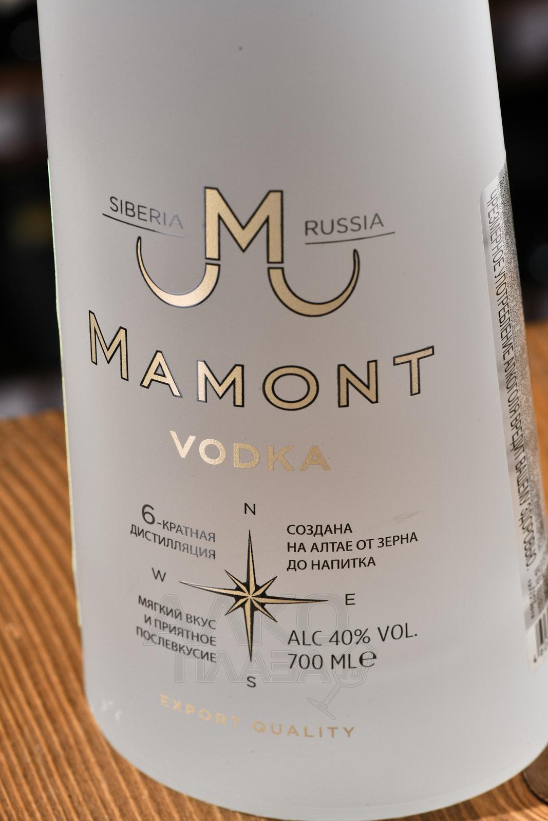 «Мамонт» – водка премиум-класса крепостью 40%. Отличается идеальной прозрачностью и мягким вкусом с нотами кедровых орехов. Напиток расфасовывают в бутылки матового стекла, выполненные в форме бивня мамонта (объёмом 0,5л и 0,7 л) и упакованные в фирменные белые картонные коробки. Также в продаже есть бутылки объёмом 0,7 л в подарочной упаковке. Напиток подают холодным (при температуре от +5 до +7 ºС) к горячим мясным блюдам, дичи и печёной рыбе, морепродуктам и салатам.