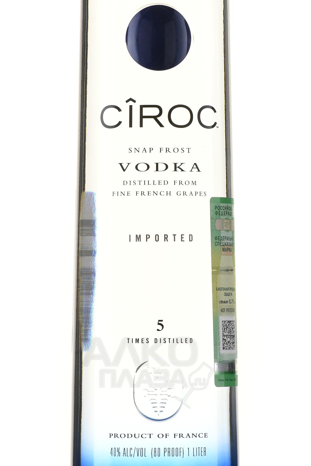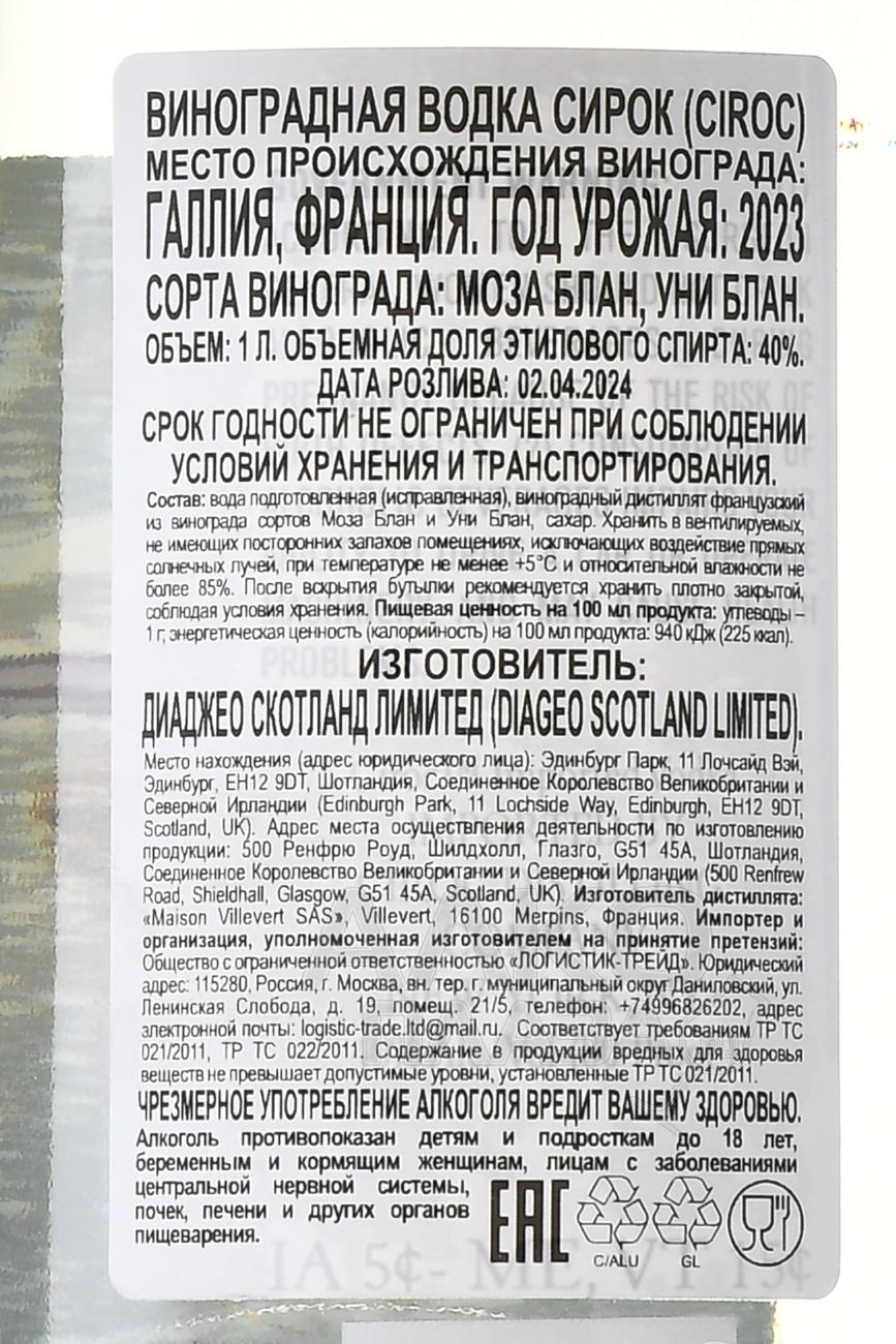 Водка Ciroc 1 л имеет категорию супер-премиум и создается из отборного винограда сортов Моза Блан и Уни Блан, который выращивают в окрестностях деревушки Корд-сюр-Сьель в Галлии. Виноград собирают вручную. Применяются холодная ферментация и пятикратная дистилляция в небольших медных кубах, аналогичных коньячным аламбикам. Такой подход обеспечивает исключительную мягкость и сохранение природного виноградного аромата. Особое место занимает процесс холодной мацерации, который придает напитку легкие цитрусовые нюансы. Благодаря этой технологии Сирок была признана одной из самых оригинальных водок в мире и получила двойное золото на конкурсе World Spirits Competition в Сан-Франциско.