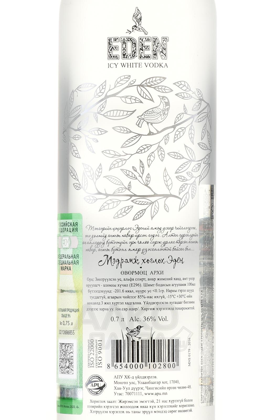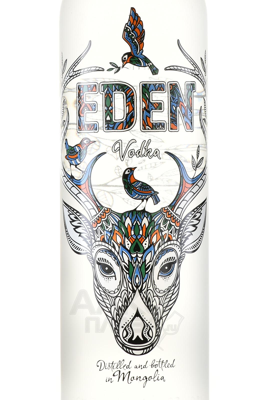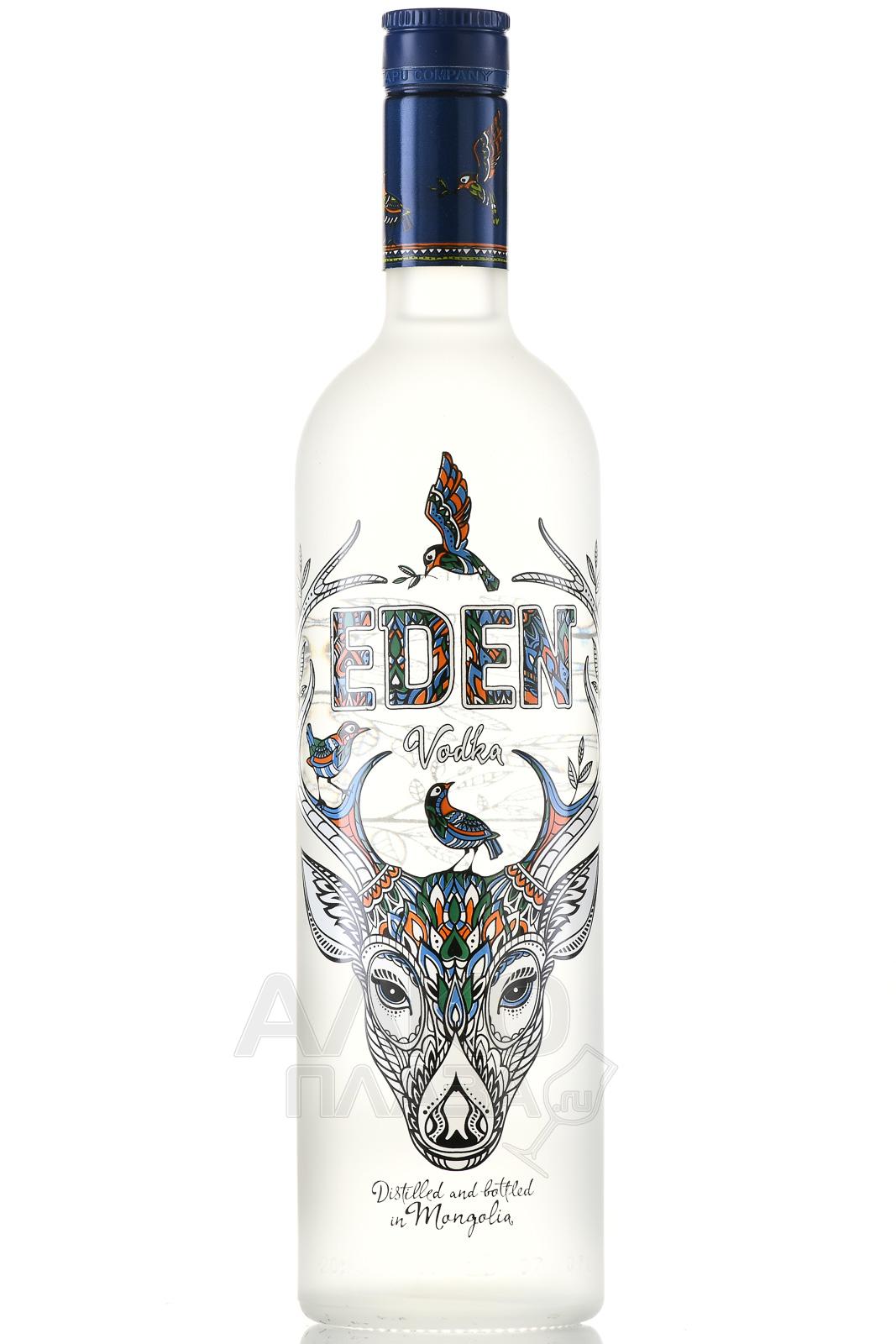 Водка Eden 0,7 л изготовлена на основе органической монгольской пшеницы и кристально чистой воды из источника у подножия священной горы Богд Хан. Кроме обычных кварцевых и угольных фильтров, спиртное очищается с помощью драгоценных камней граната. Разливается напиток в матовую бутылку с изображениями, напоминающими витражи. В центре образа бренда – олень и соловей, согласно легенде принесшие на землю жизнь и плодородие и ставшие символом творчества.
