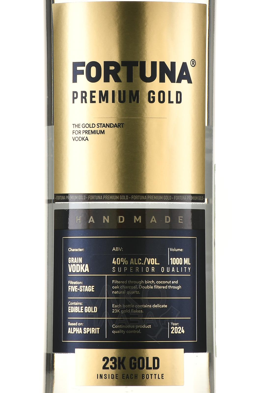 Водка Fortuna Premium Gold 1 л имеет высшую категорию качества и изготавливается по не имеющей аналогов рецептуре. Из отборной сортовой пшеницы получают ректификованный спирт «Альфа», который проходит три этапа очистки. На первом его пропускают через фильтр с кокосовым углем, который обогащен ионами серебра, на втором — через активированный уголь из кавказского дуба, на третьем — через березовый уголь. В напиток добавляют кленовый сироп и хлопья пищевого сусального 23-каратного золота. Водка разливается в высокую бутылку с этикеткой в стиле хай-тек, которая создавалась с применением технологии объемной печати.