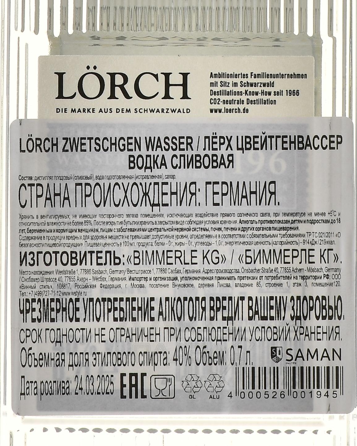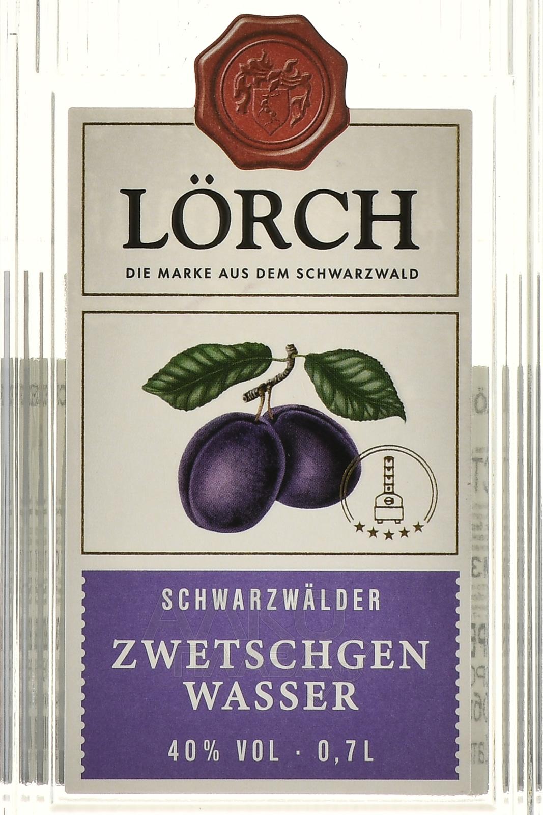 Водка Lorch Schwarzwalder Zwetschgen-Wasser 0,7 л — плодовый сорокаградусный немецкий алкоголь, сырьем для которого послужили отборные сливы, собранные спелыми. Сок с кусочками мякоти ферментировался в стальной таре и перегонялся. В созданный таким способом дистиллят добавили очищенную воду для получения необходимой крепости.